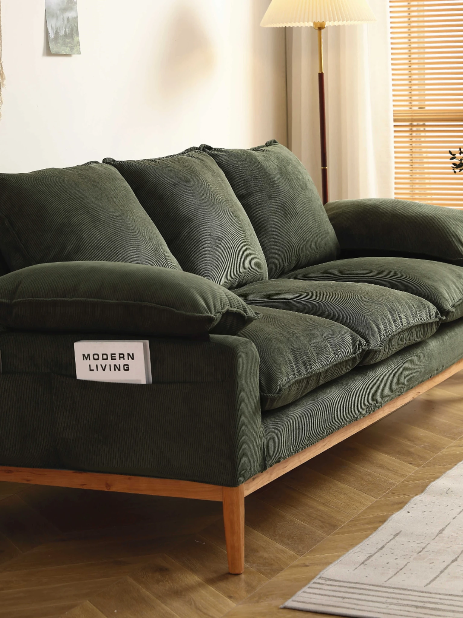 北欧スタイルの無垢材ソファ、雲のような柔らかい布製、侘寂風デザインのホワイトアッシュ材使用。現代的でシンプルなミニマリスト家具、小型リビングに最適!