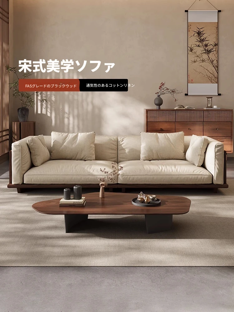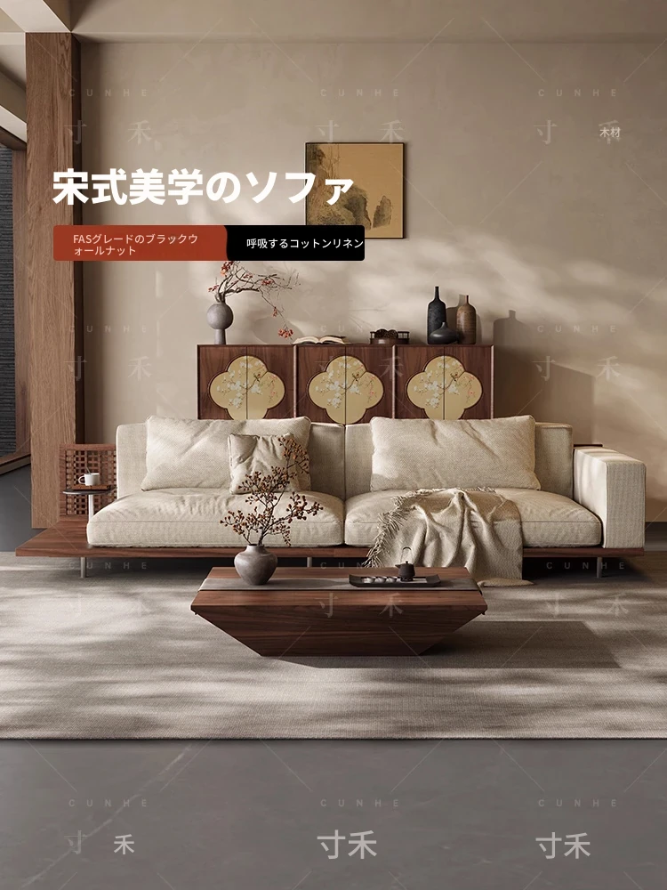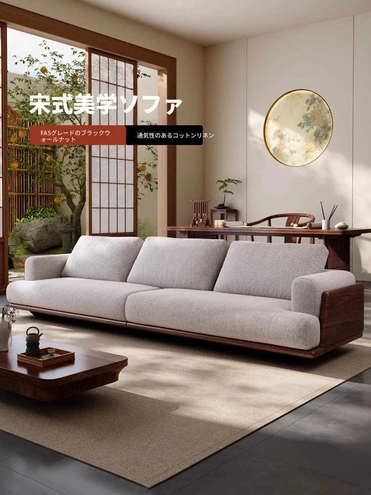 寸禾宋風美学の黒胡桃無垢材コットンリネン布製ソファー 新中式リビングルーム用 2025年新作登場!スタイリッシュで快適な空間を演出します。