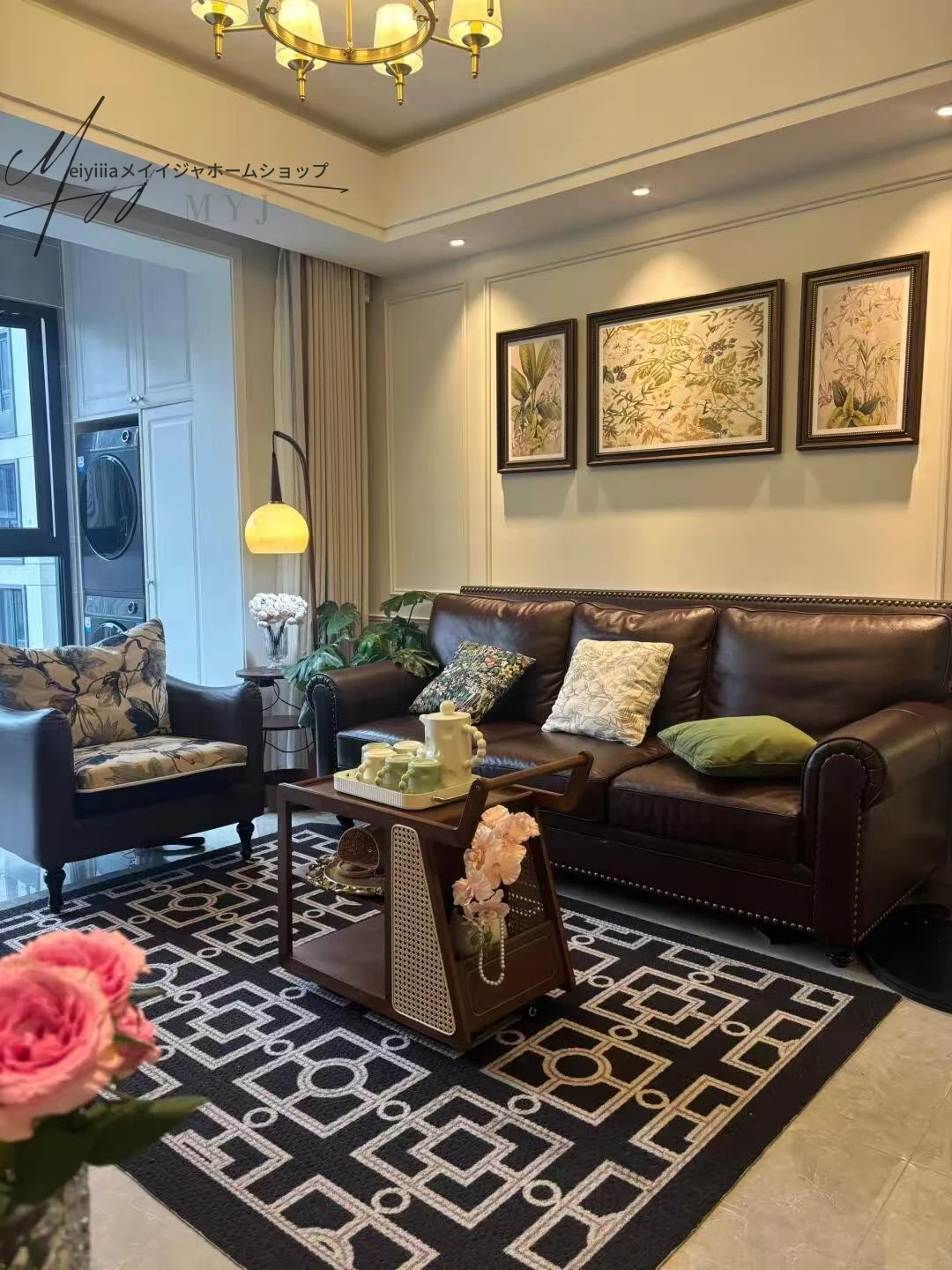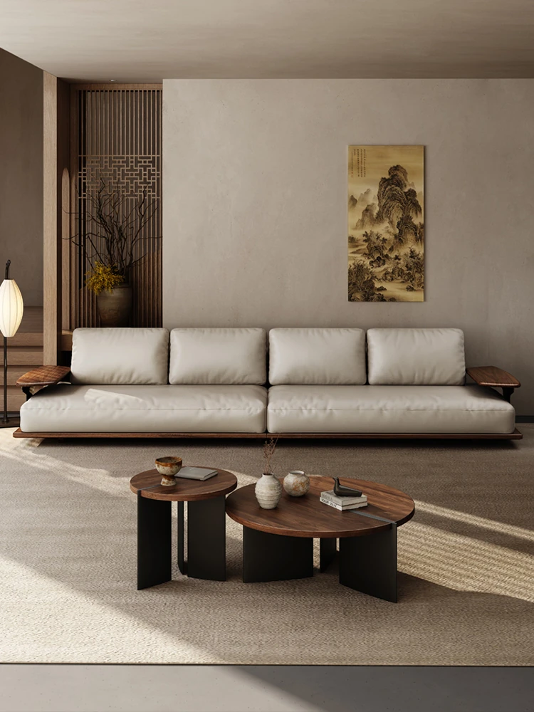 寸禾の宋風美学、ブラックウォールナット無垢材&本革ソファ。小さな空間にもぴったりなモダン新中式デザイン。2025年新作、洗練された客間を演出します。