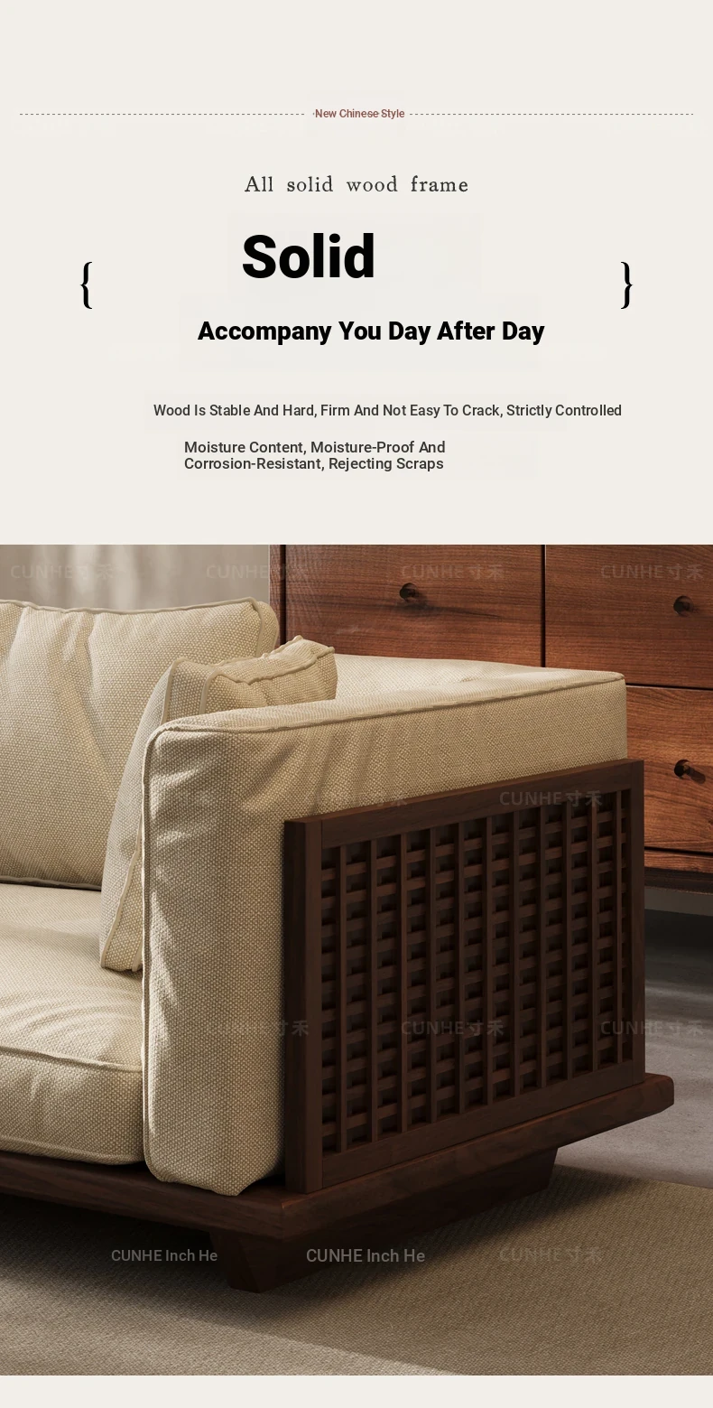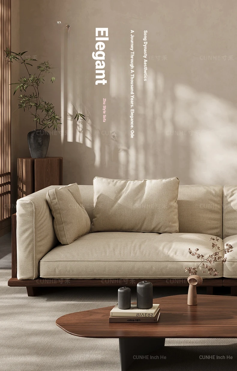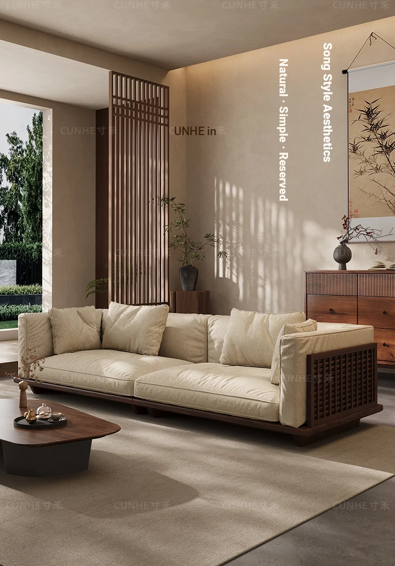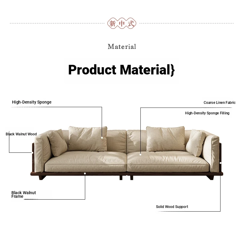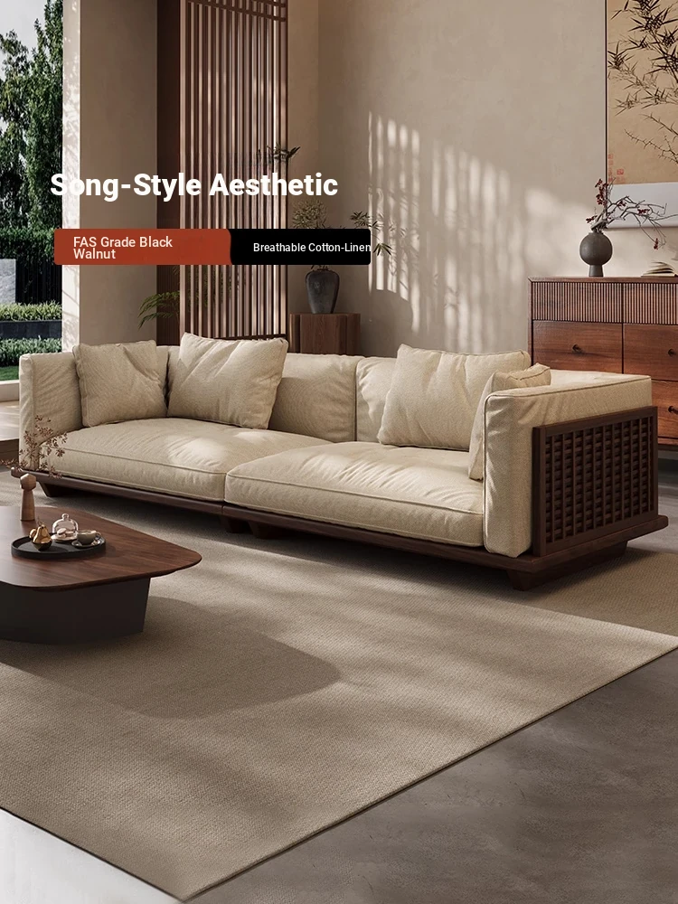 "2025 New Style Small Space Sofa - Elegant Song Dynasty Aesthetic in Black Walnut Wood with Cotton and Linen Fabric for Modern Chinese Living Rooms"