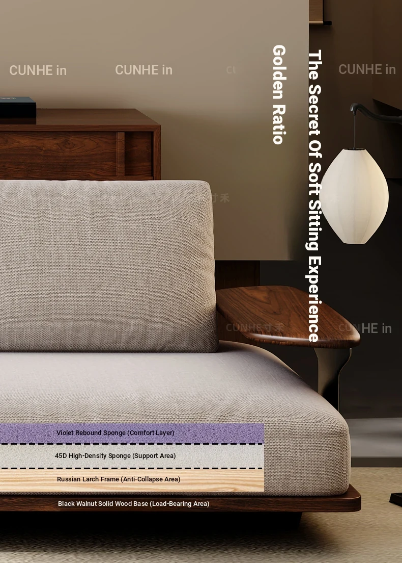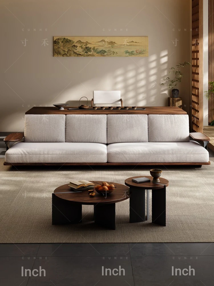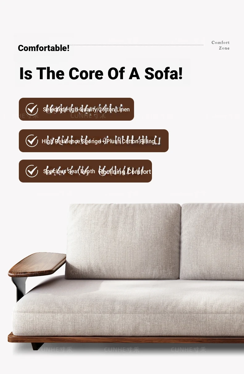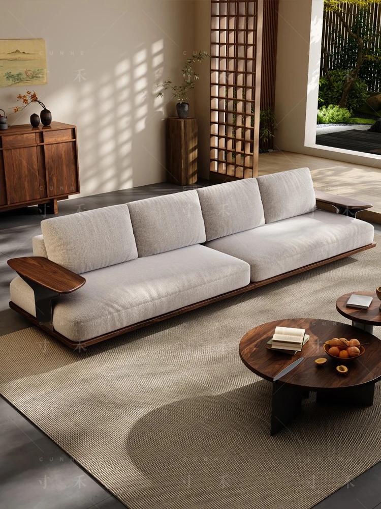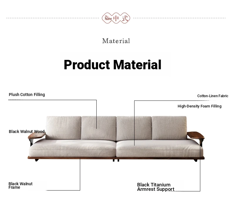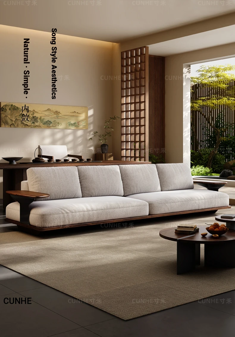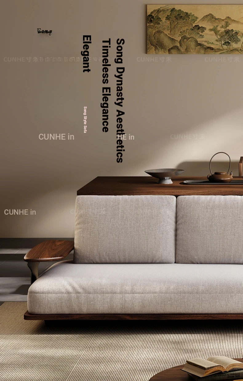 "Duanhe Song Style Aesthetic Walnut Wood New Chinese Cotton Linen Genuine Leather Solid Wood Sofa - Modern Minimalist Design for Living Room, 2025 New Arrival"