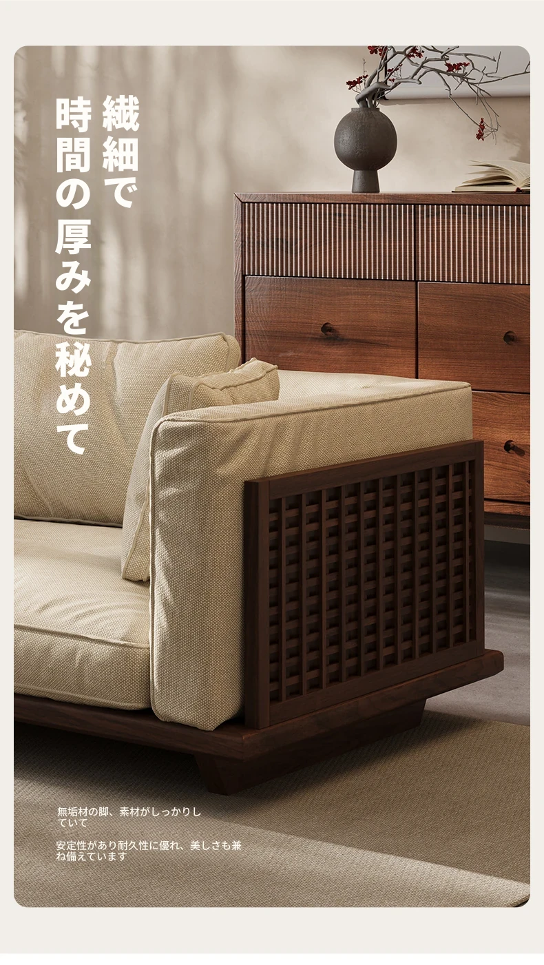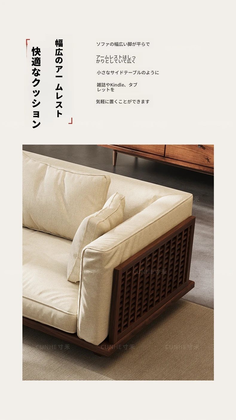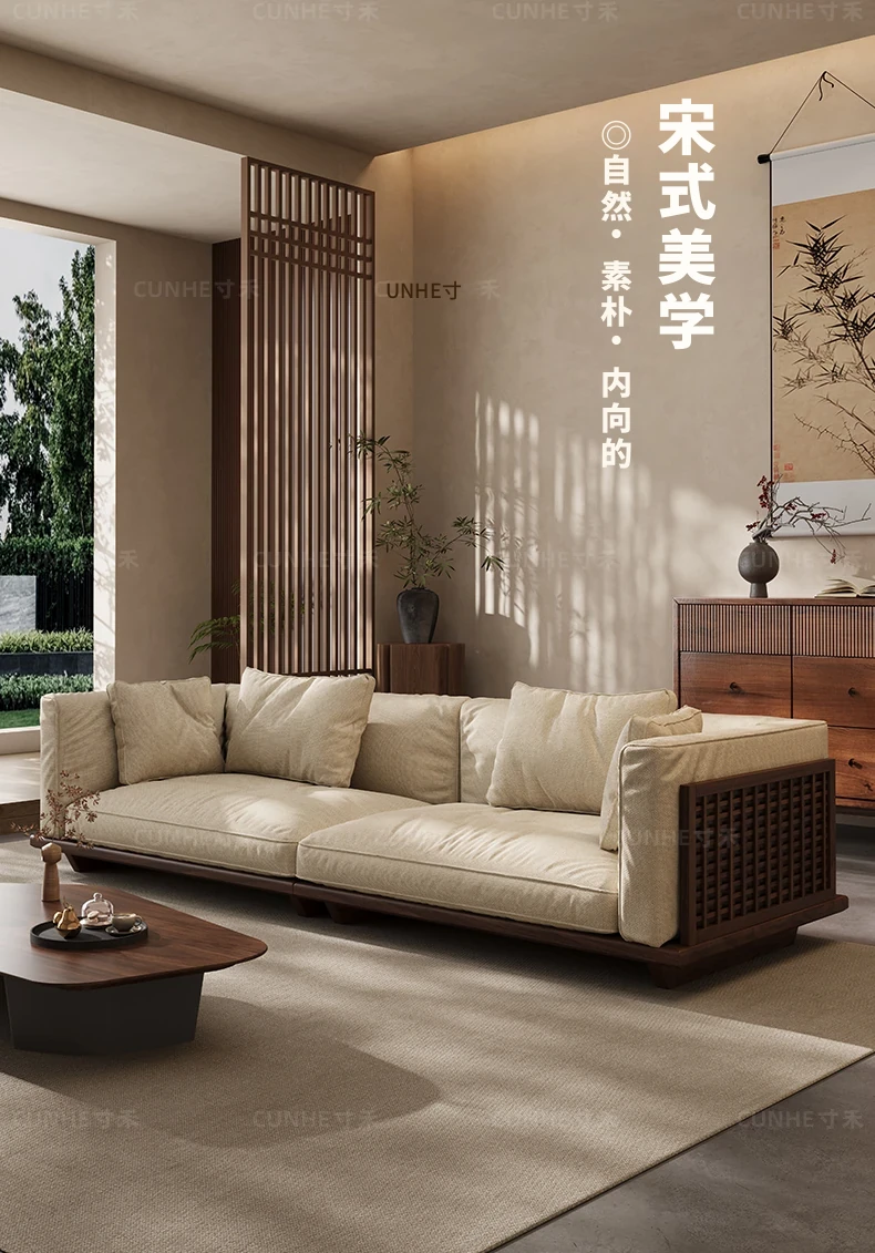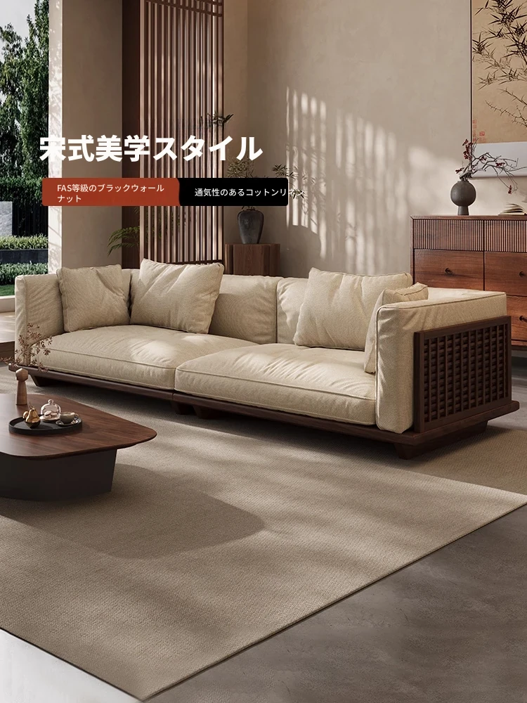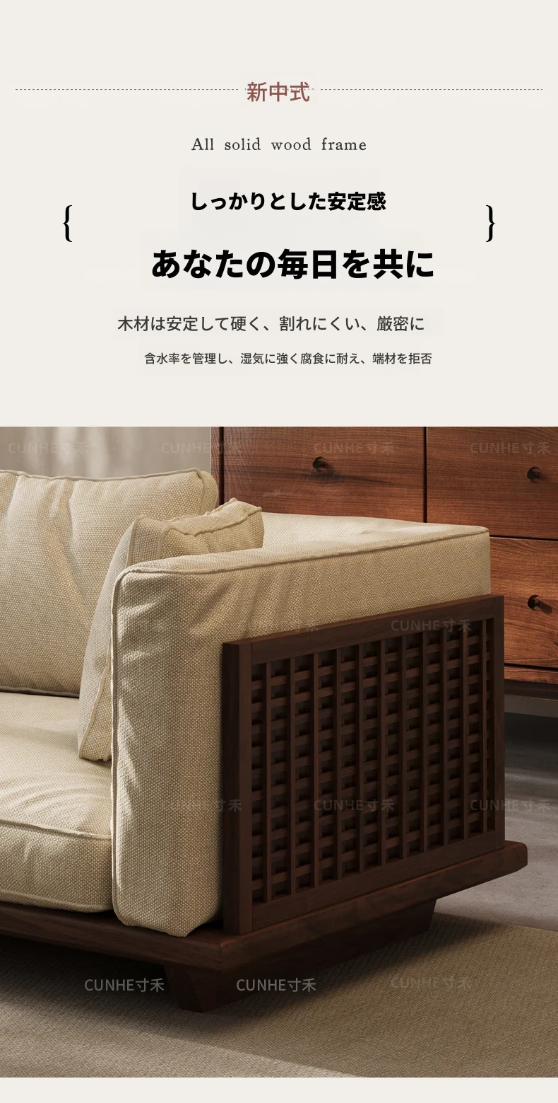 寸禾宋式美学のブラックウォルナット無垢材ソファ - コットンリネン素材、小型住居に最適!新中式スタイルで、2025年最新デザインの家庭用リビング家具です。心地よい空間を演出します!