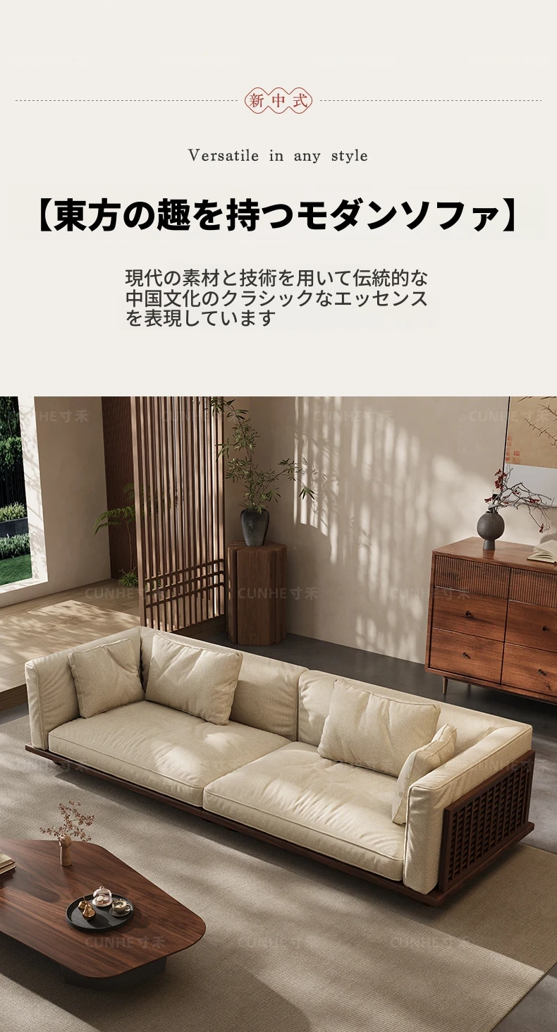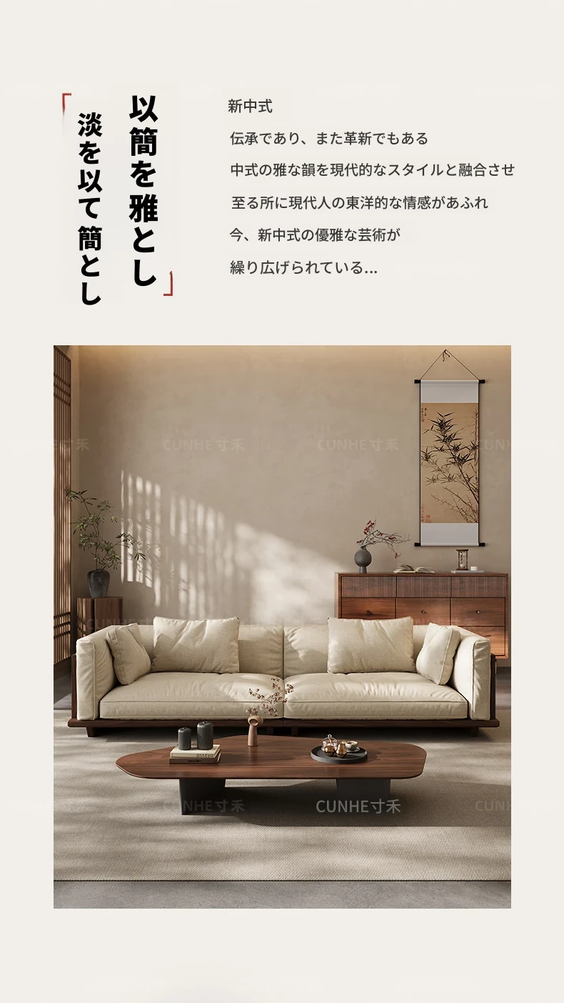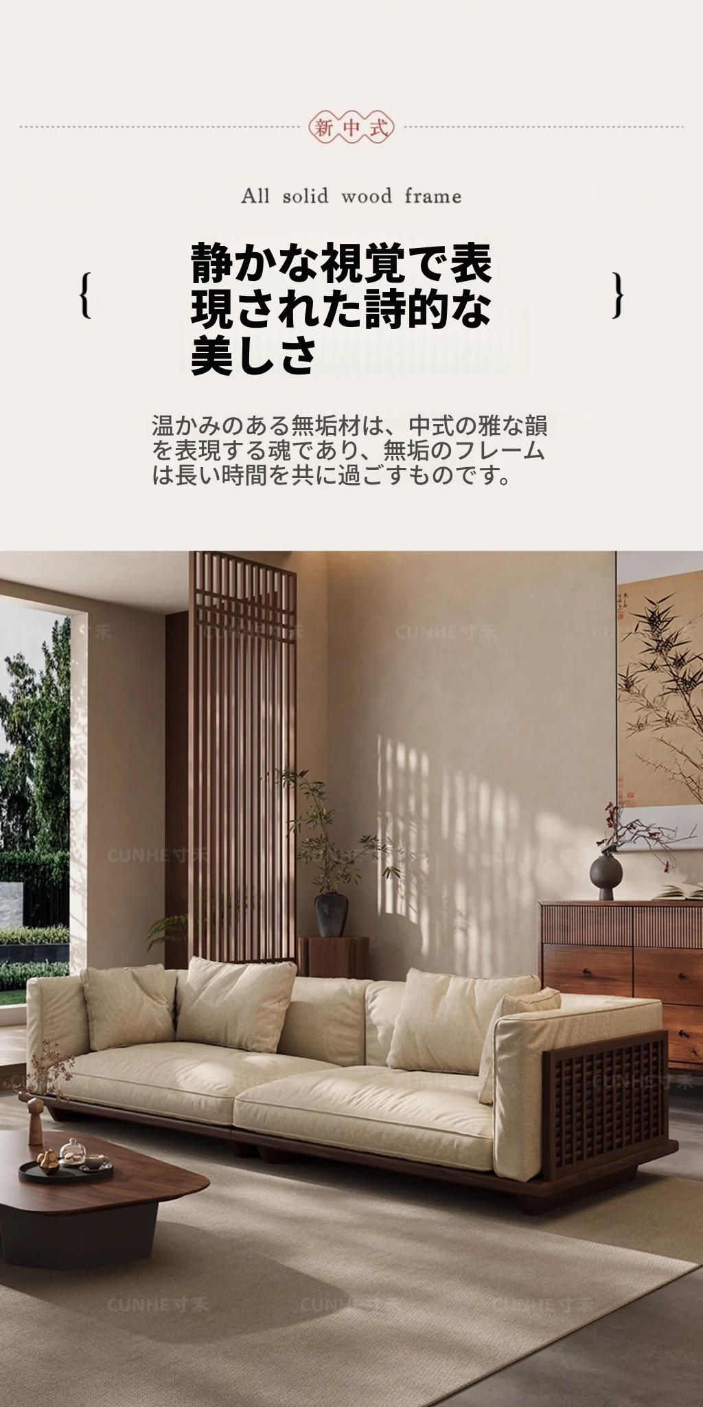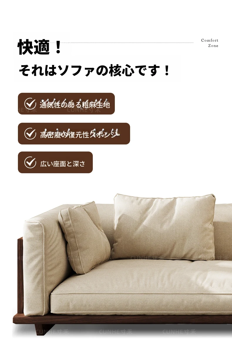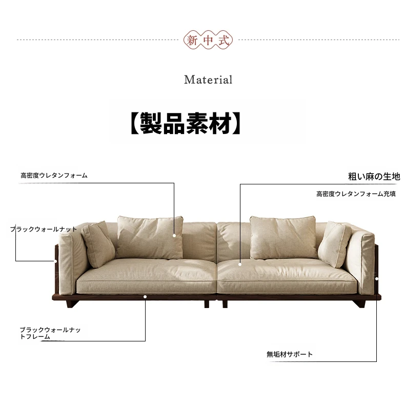 寸禾宋式美学のブラックウォルナット無垢材ソファ - コットンリネン素材、小型住居に最適!新中式スタイルで、2025年最新デザインの家庭用リビング家具です。心地よい空間を演出します!