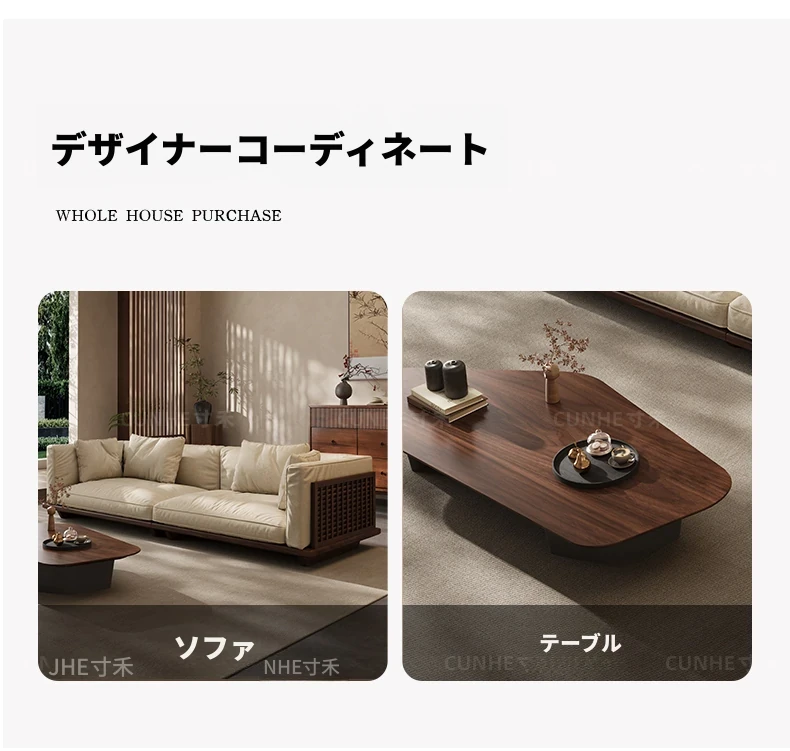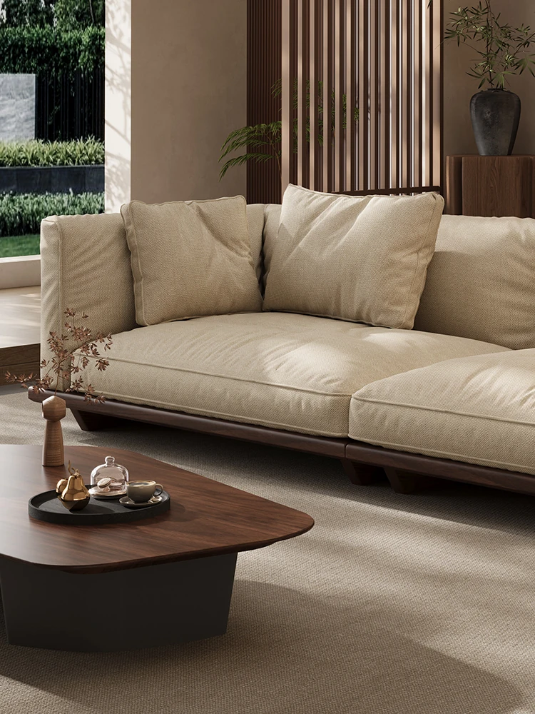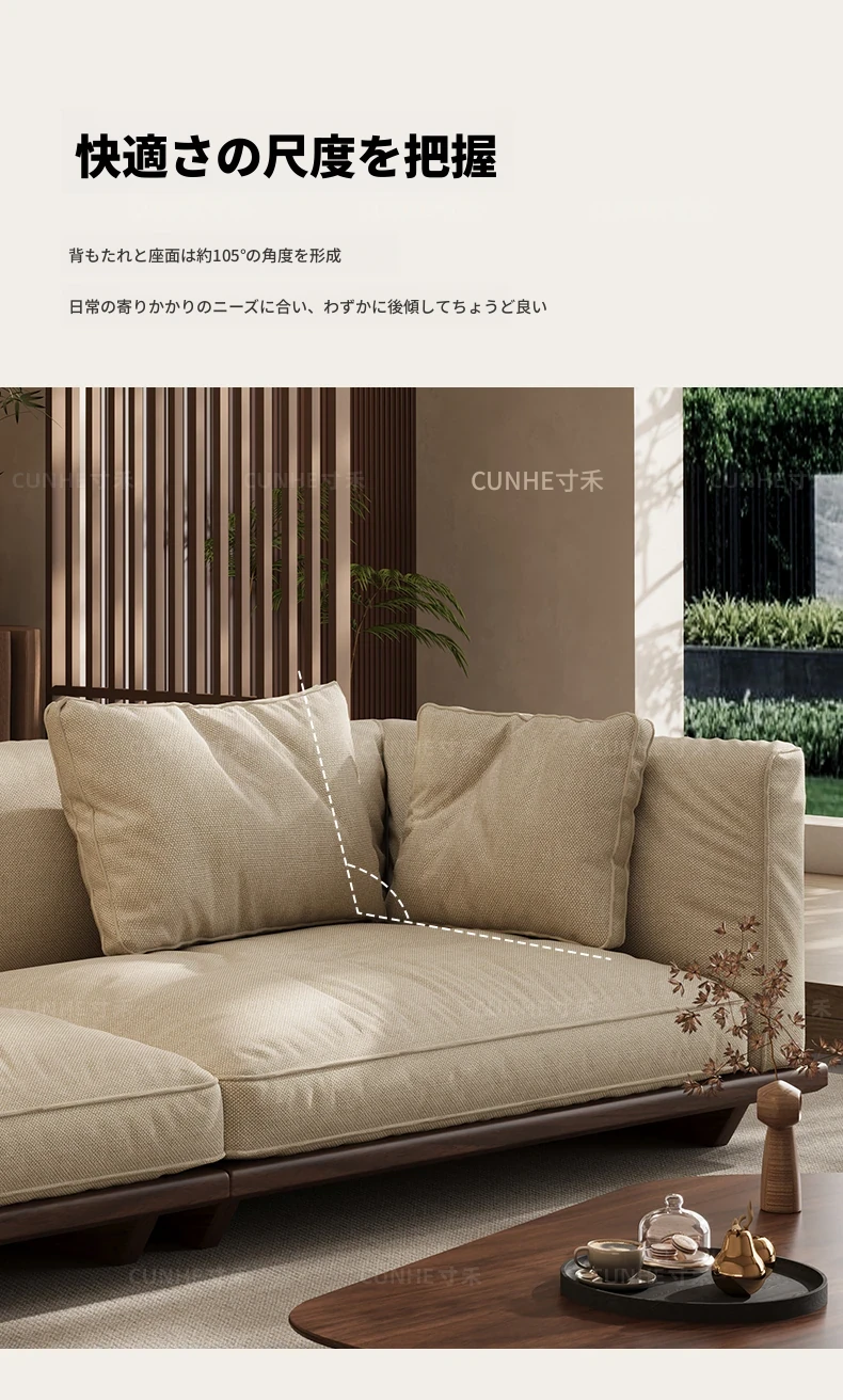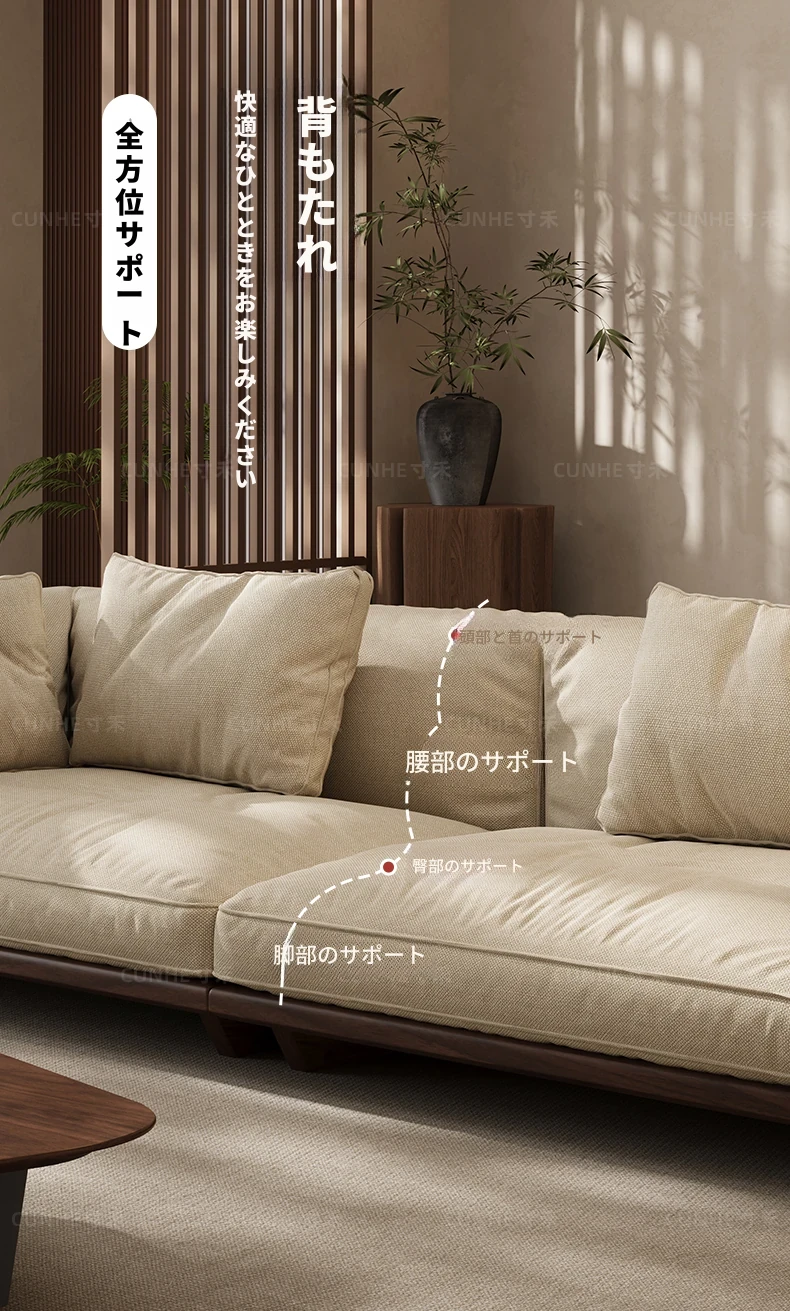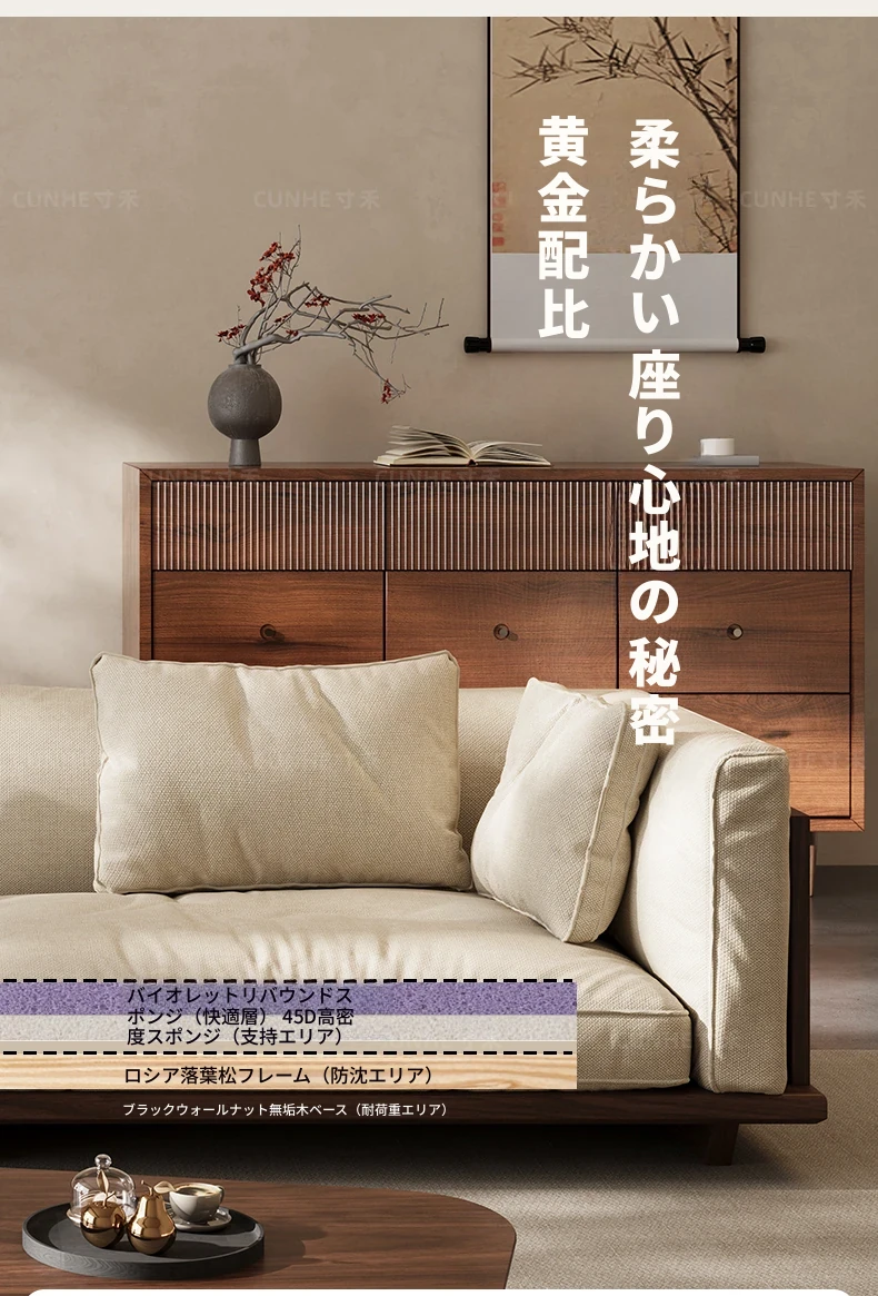 寸禾宋式美学のブラックウォルナット無垢材ソファ - コットンリネン素材、小型住居に最適!新中式スタイルで、2025年最新デザインの家庭用リビング家具です。心地よい空間を演出します!