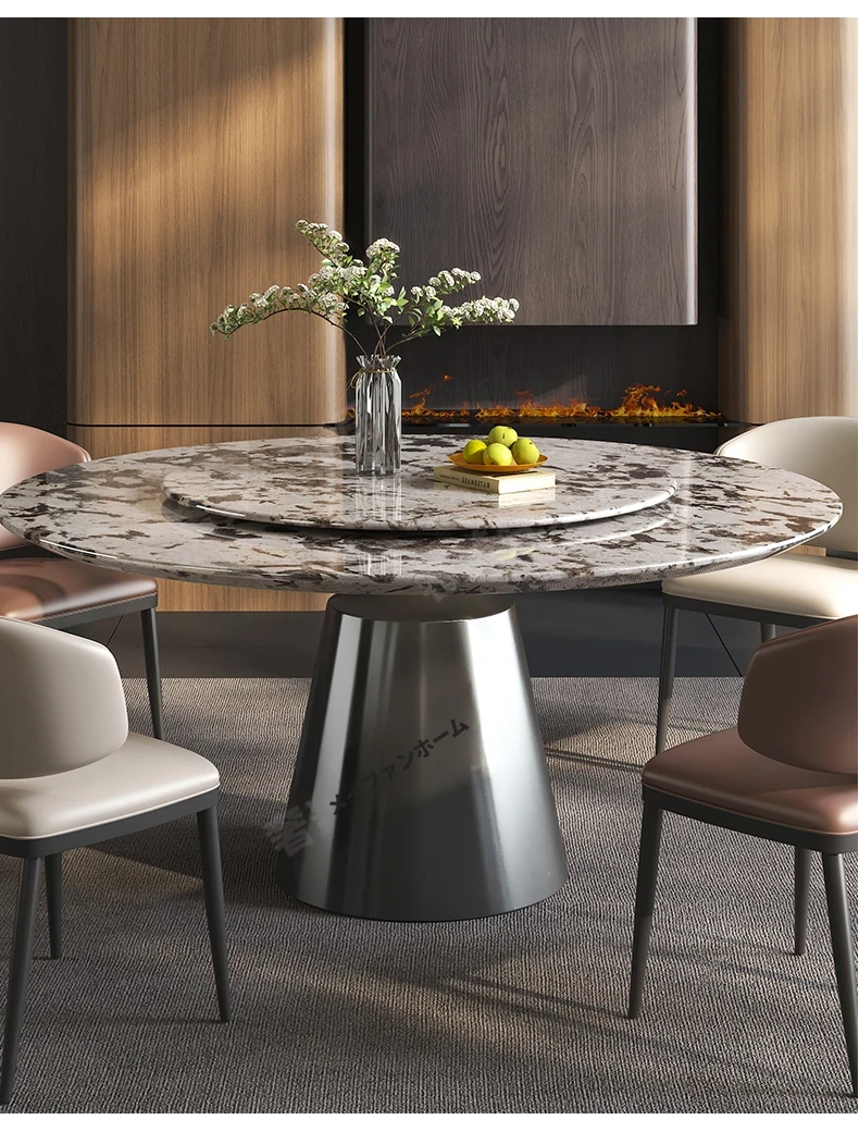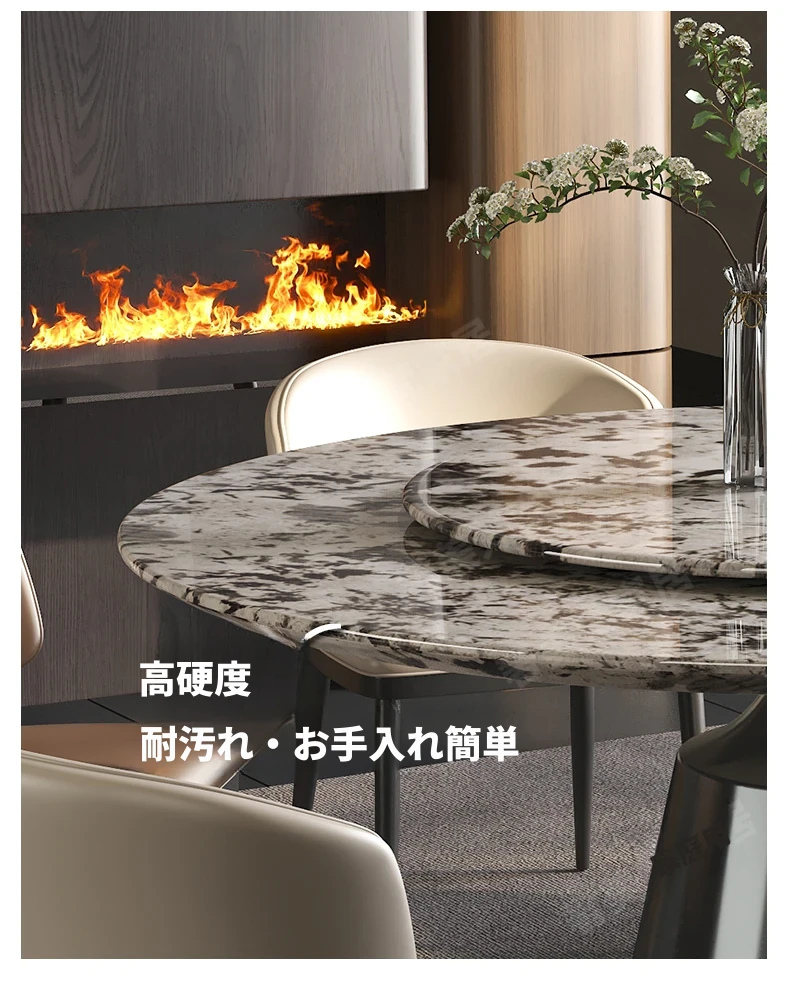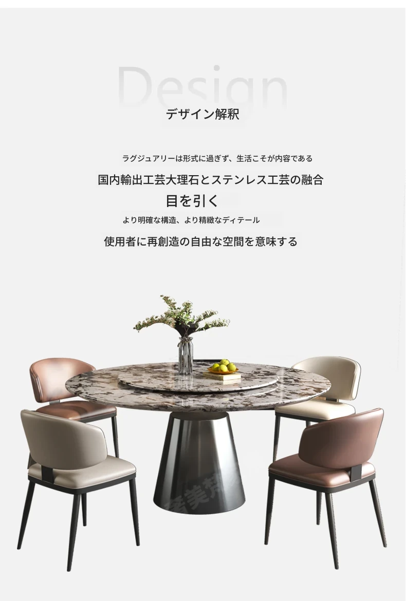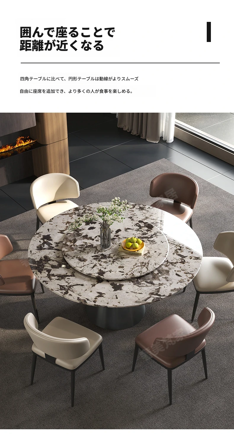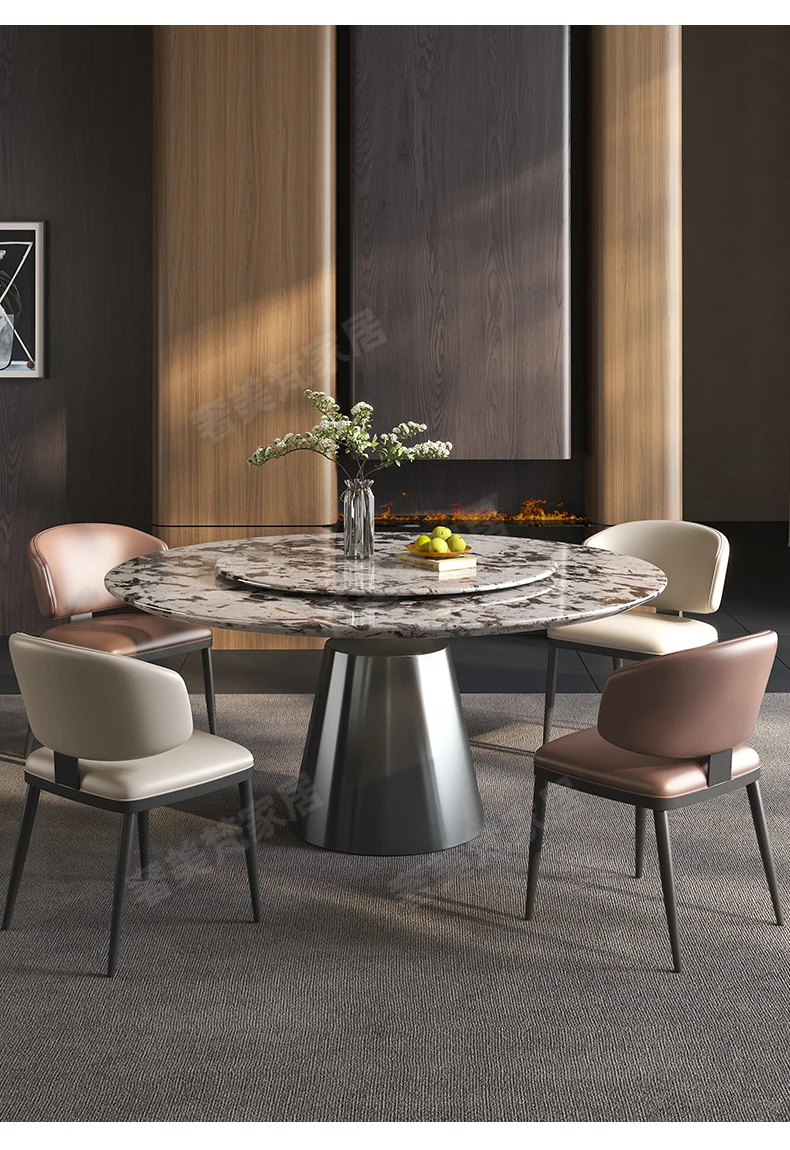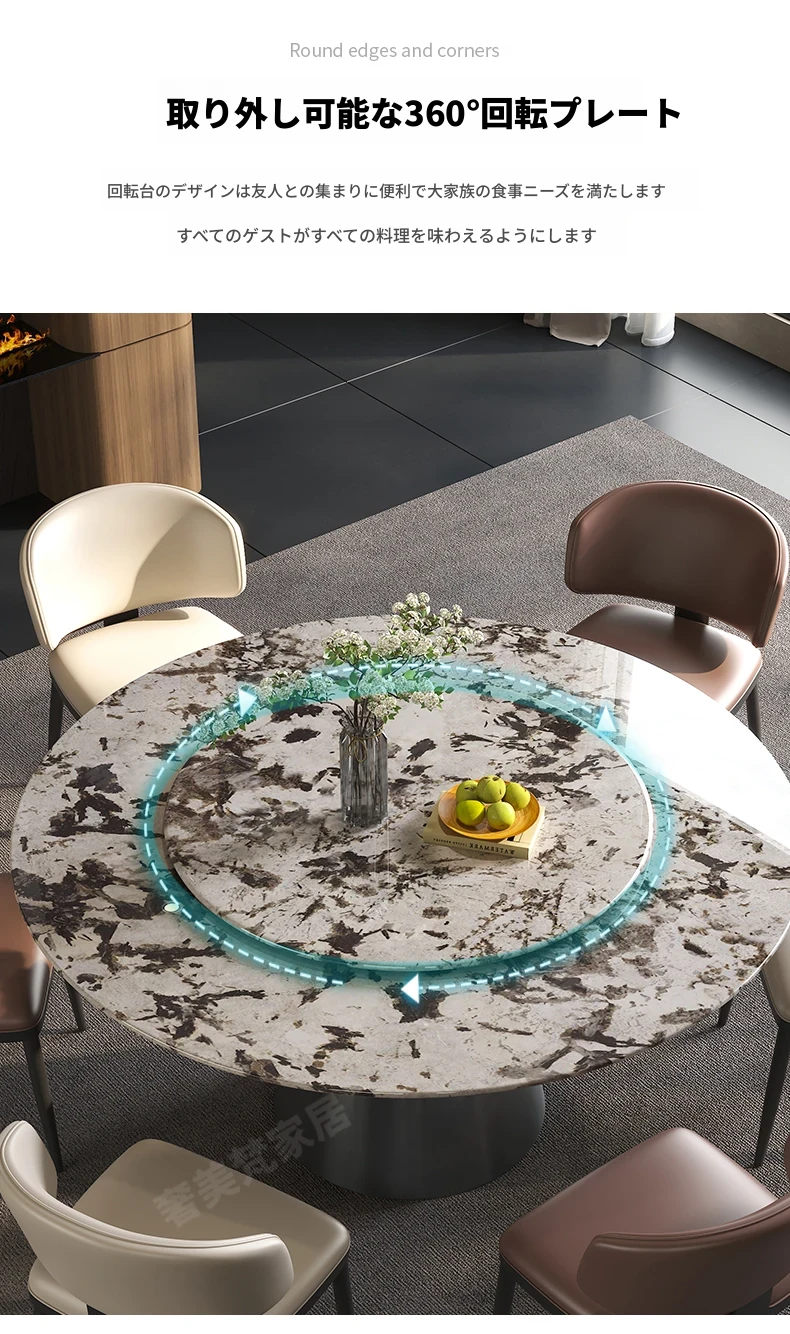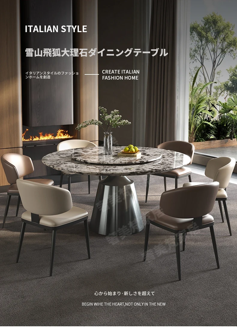 軽やかで洗練された現代的な雪山の飛狐模様を持つ天然石の心大理石製ラウンドダイニングテーブル & チェアセット、回転式デザインで家族や友人との食事をもっと楽しく!