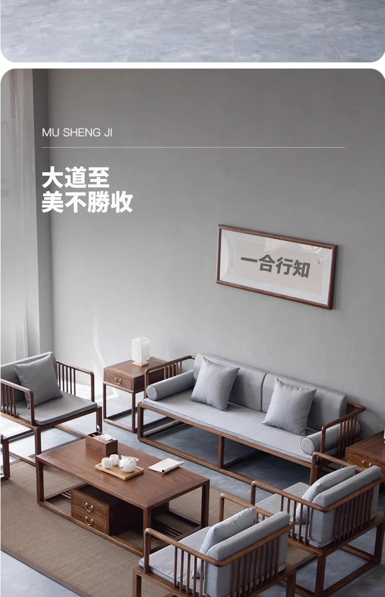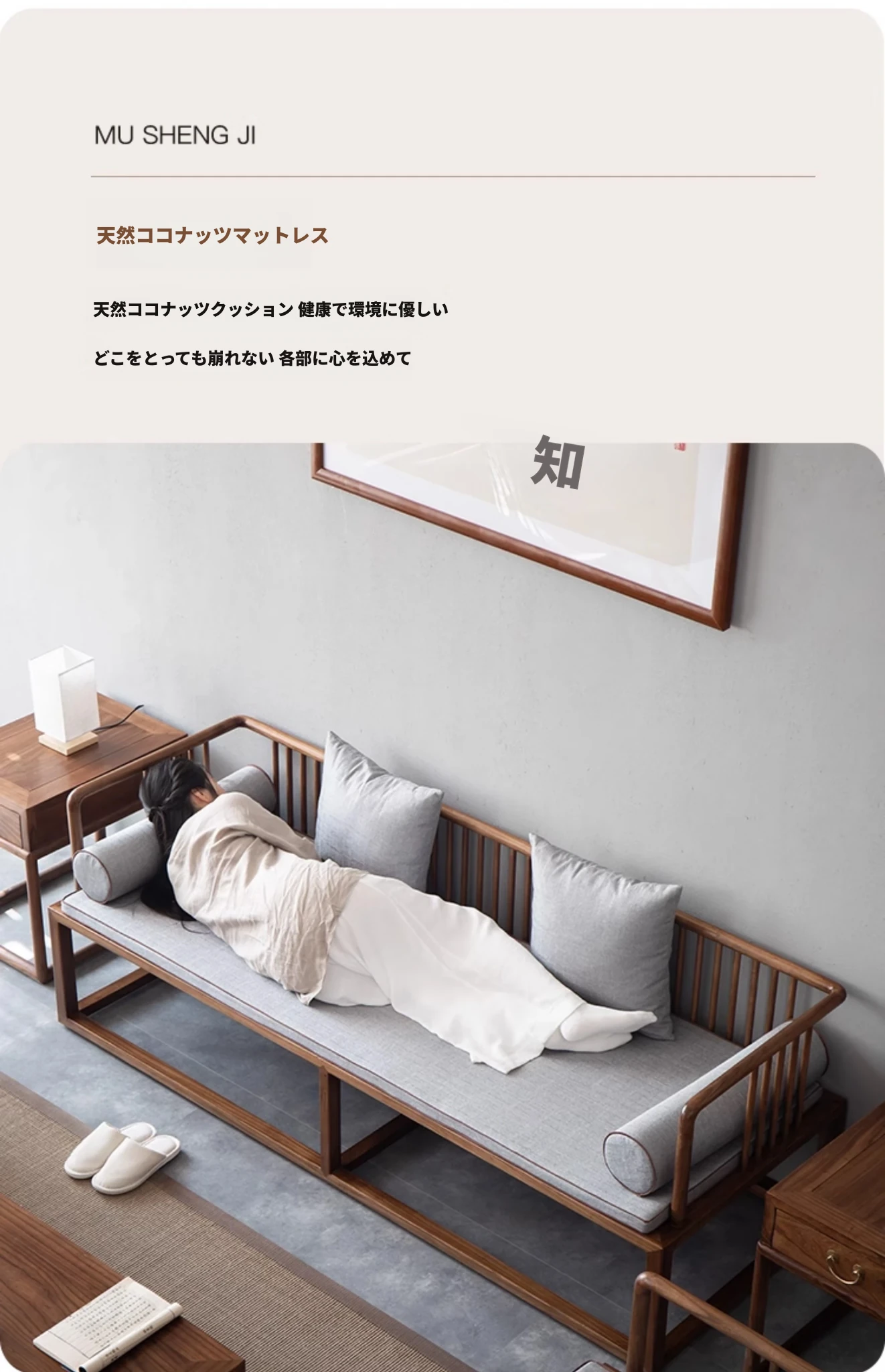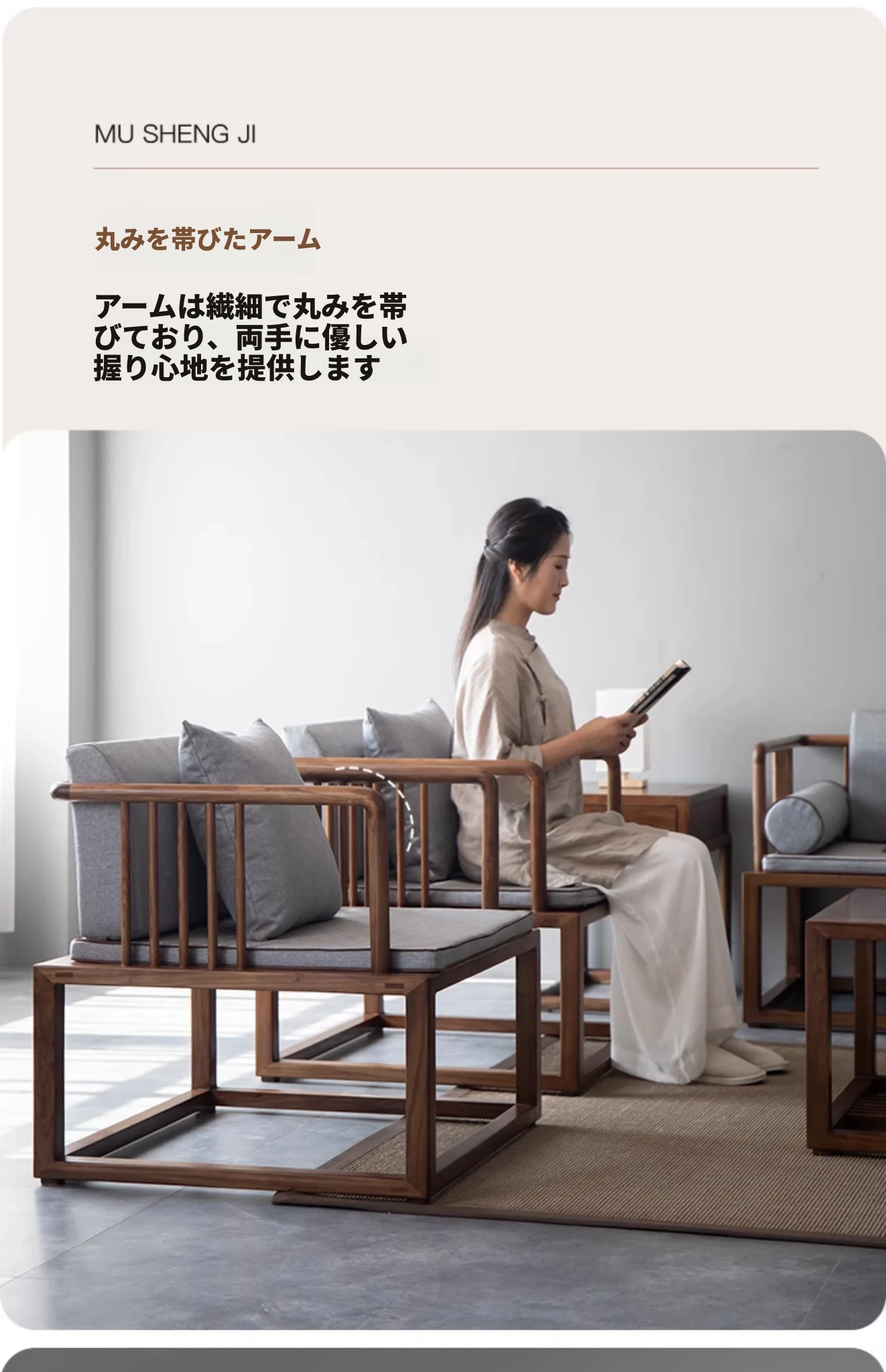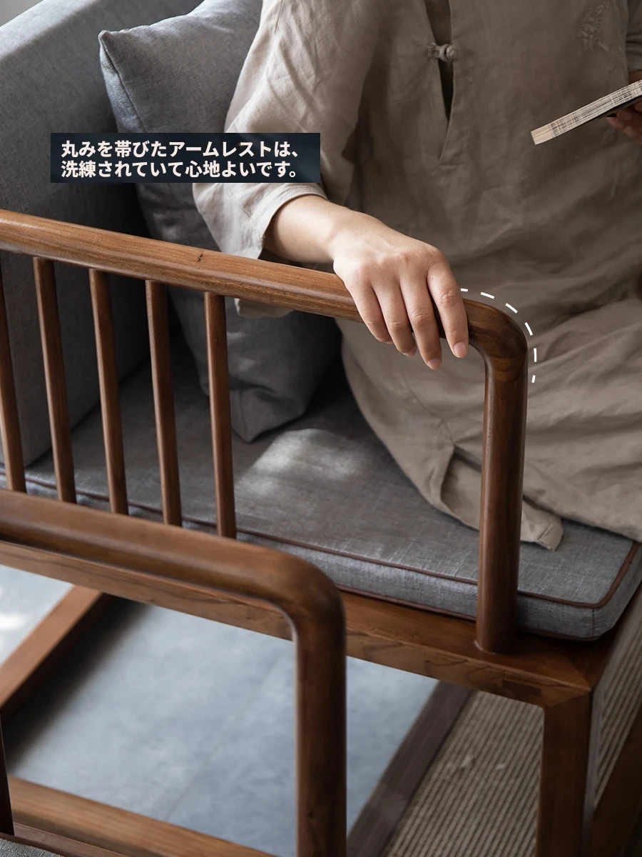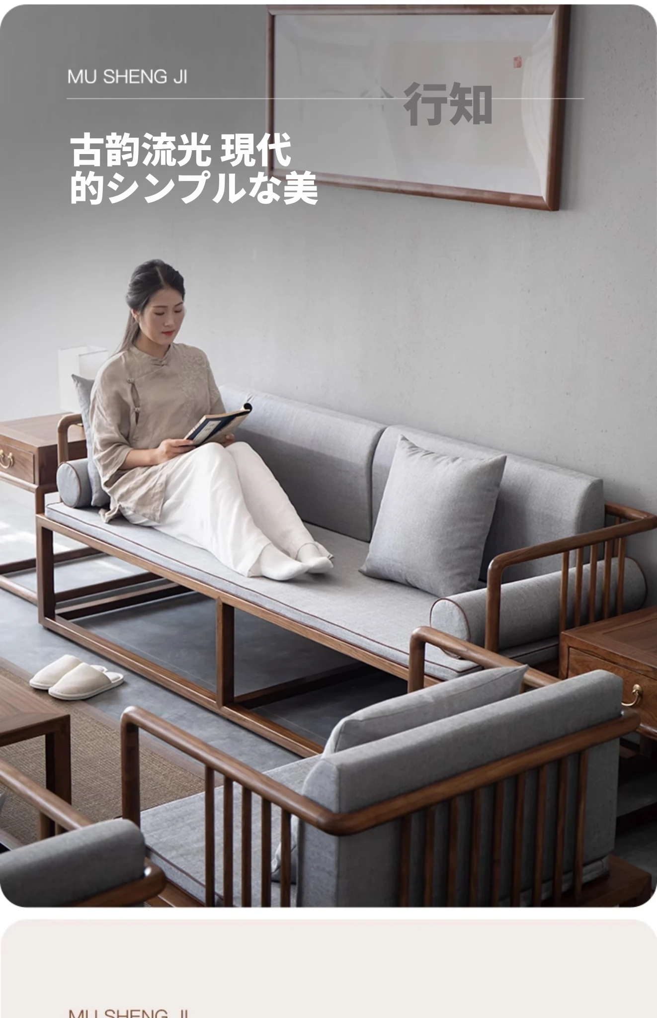 新中式デザインのソファセット - ブラックウォールナットの無垢材使用、モダンでシンプルなリビング向けファブリックの貴妃椅子。おしゃれで快適な中華風の家庭用家具!