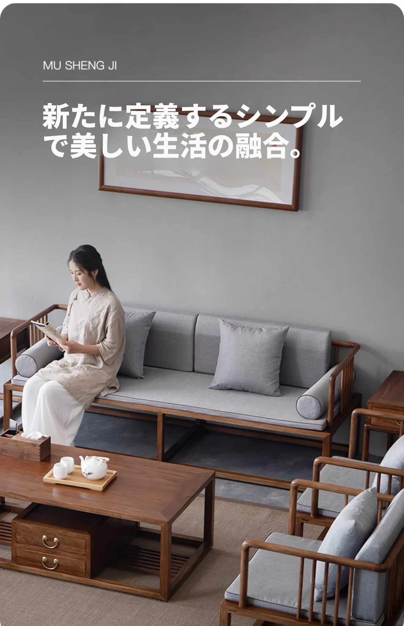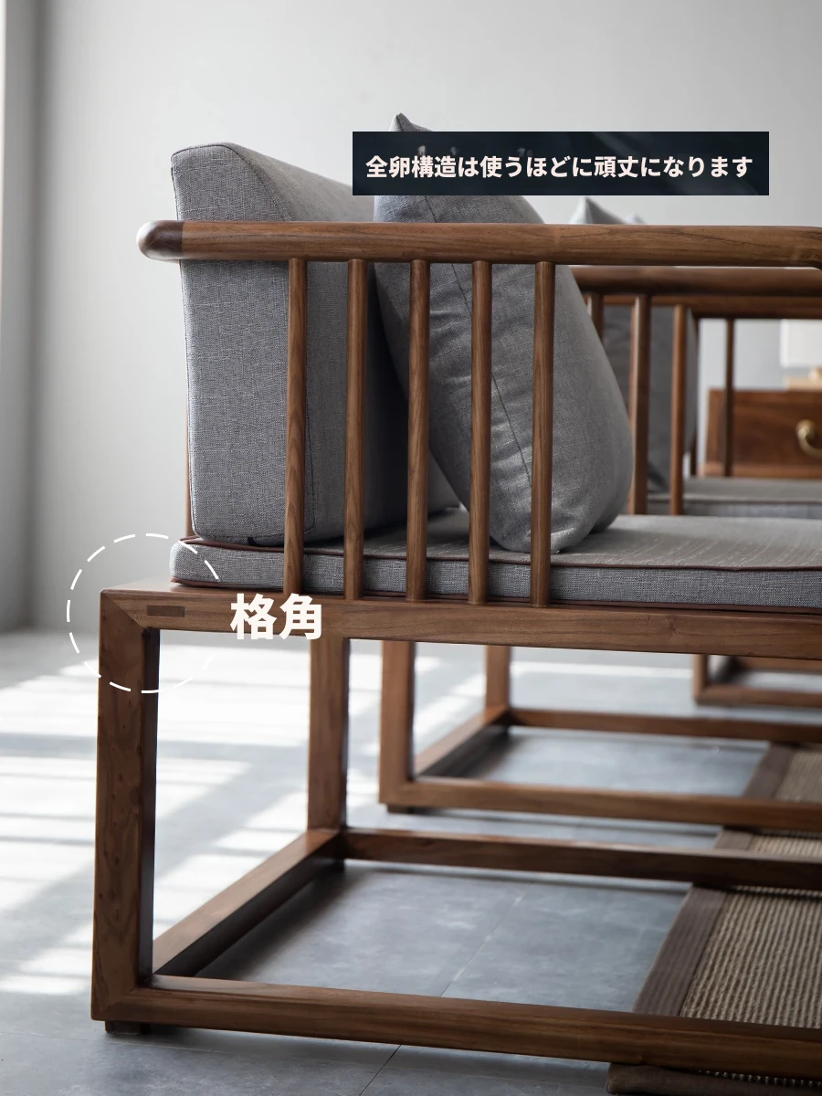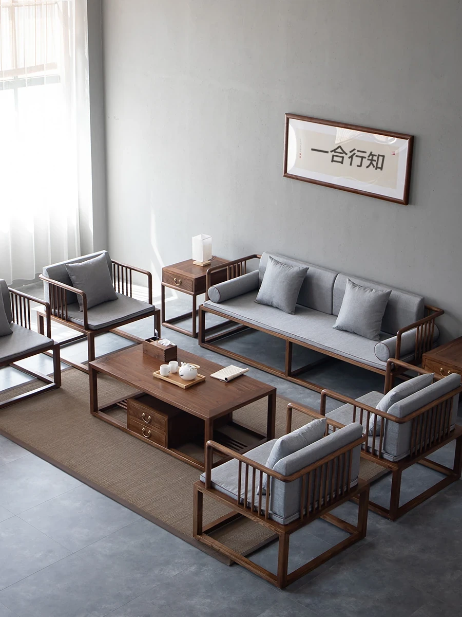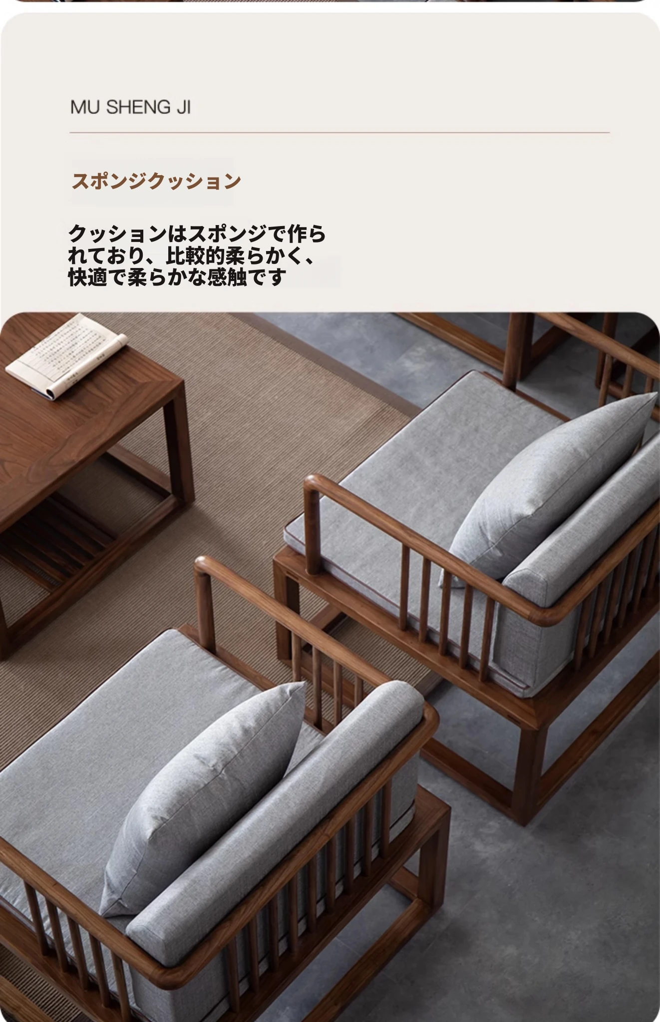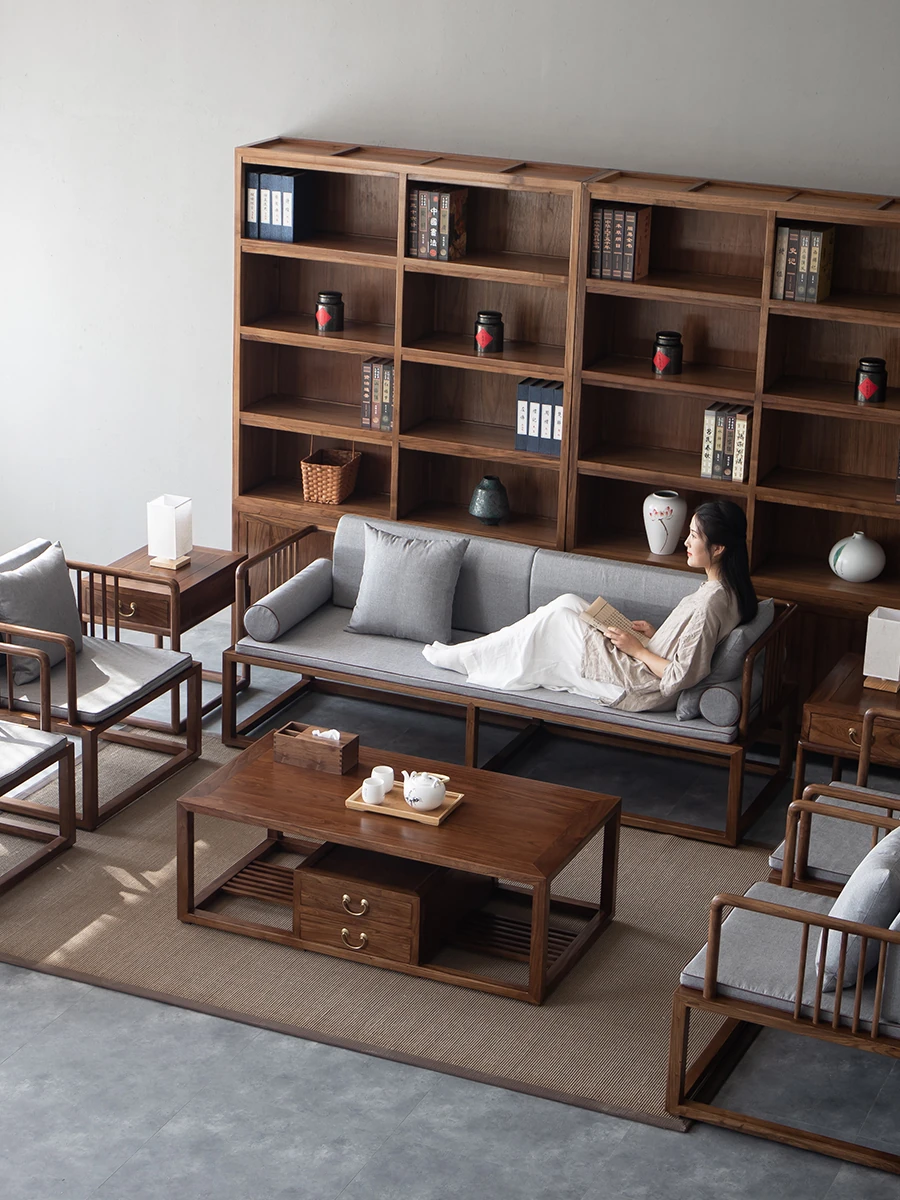 新中式デザインのソファセット - ブラックウォールナットの無垢材使用、モダンでシンプルなリビング向けファブリックの貴妃椅子。おしゃれで快適な中華風の家庭用家具!