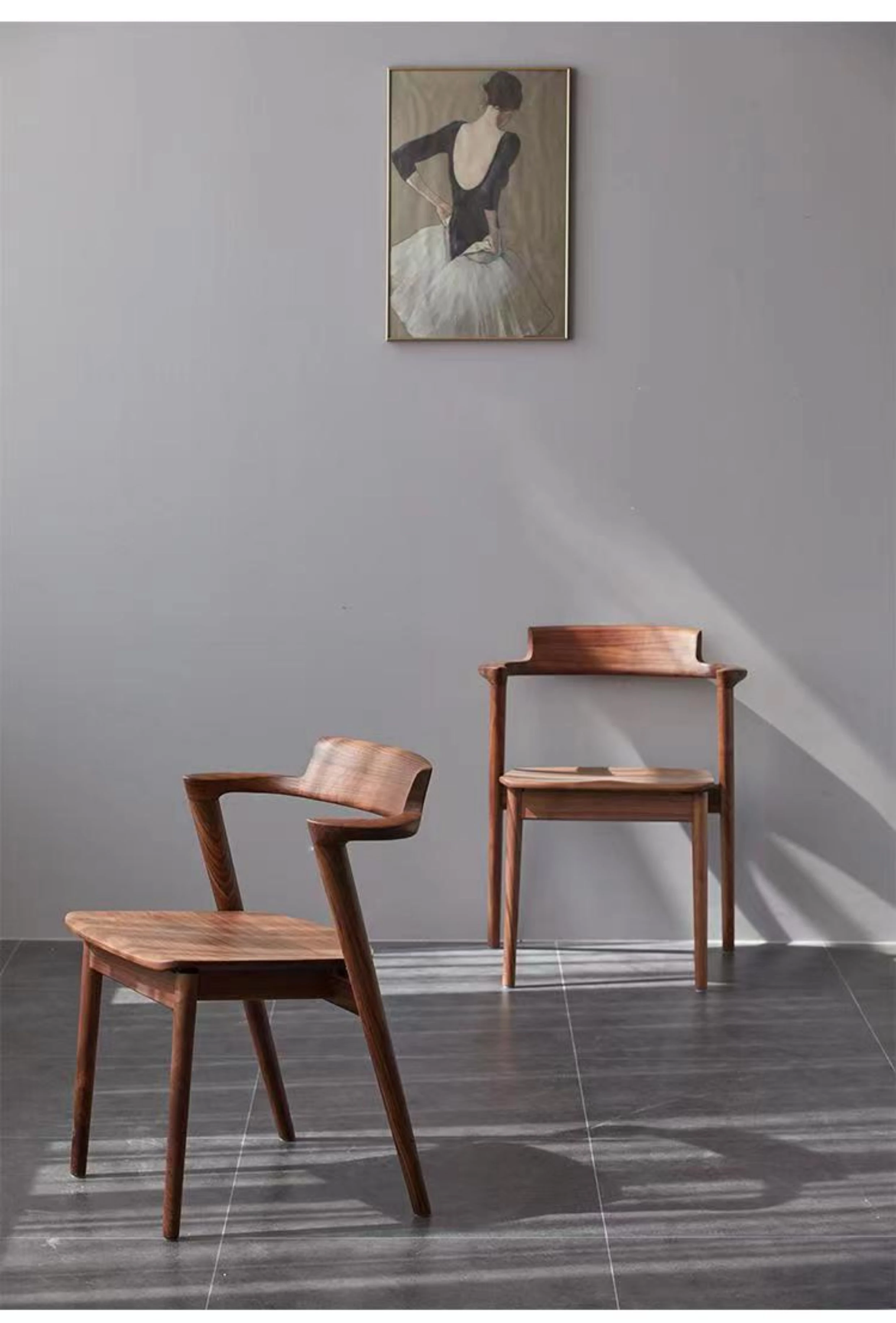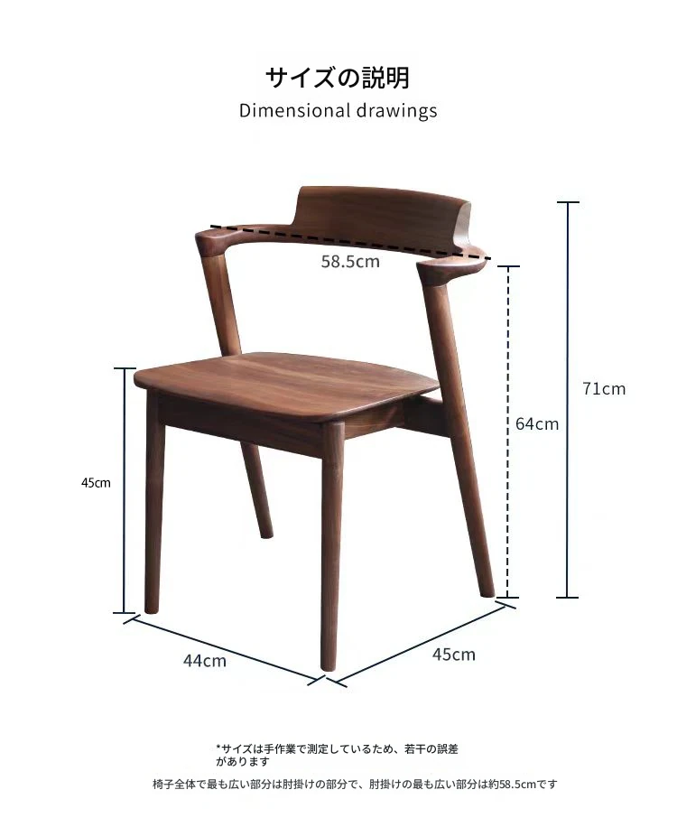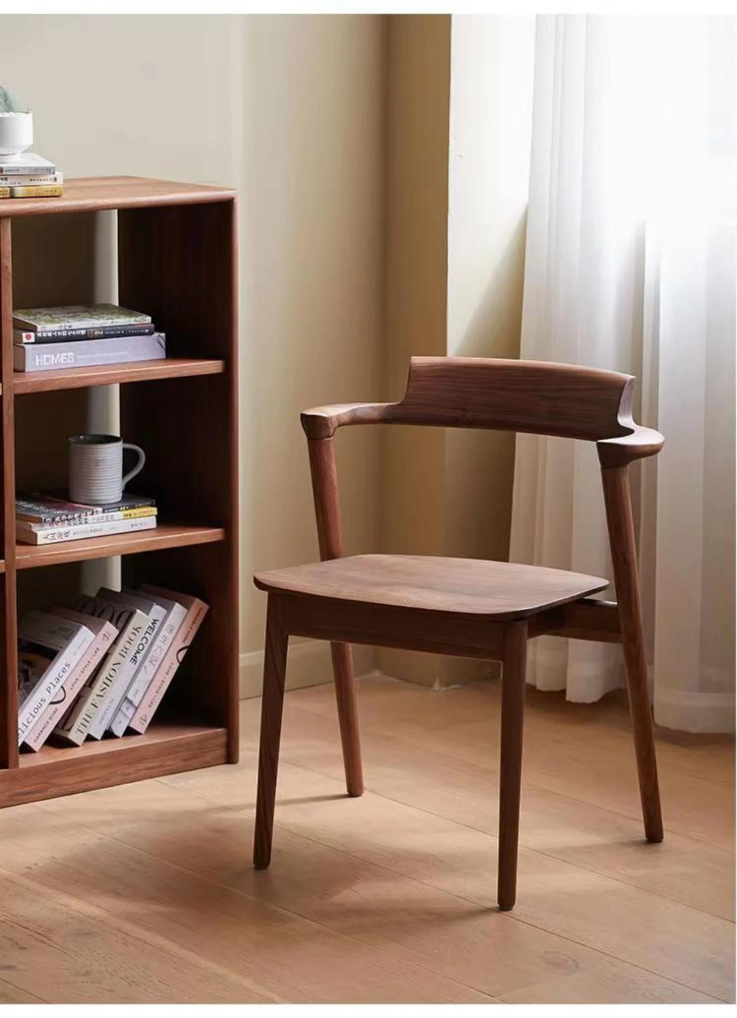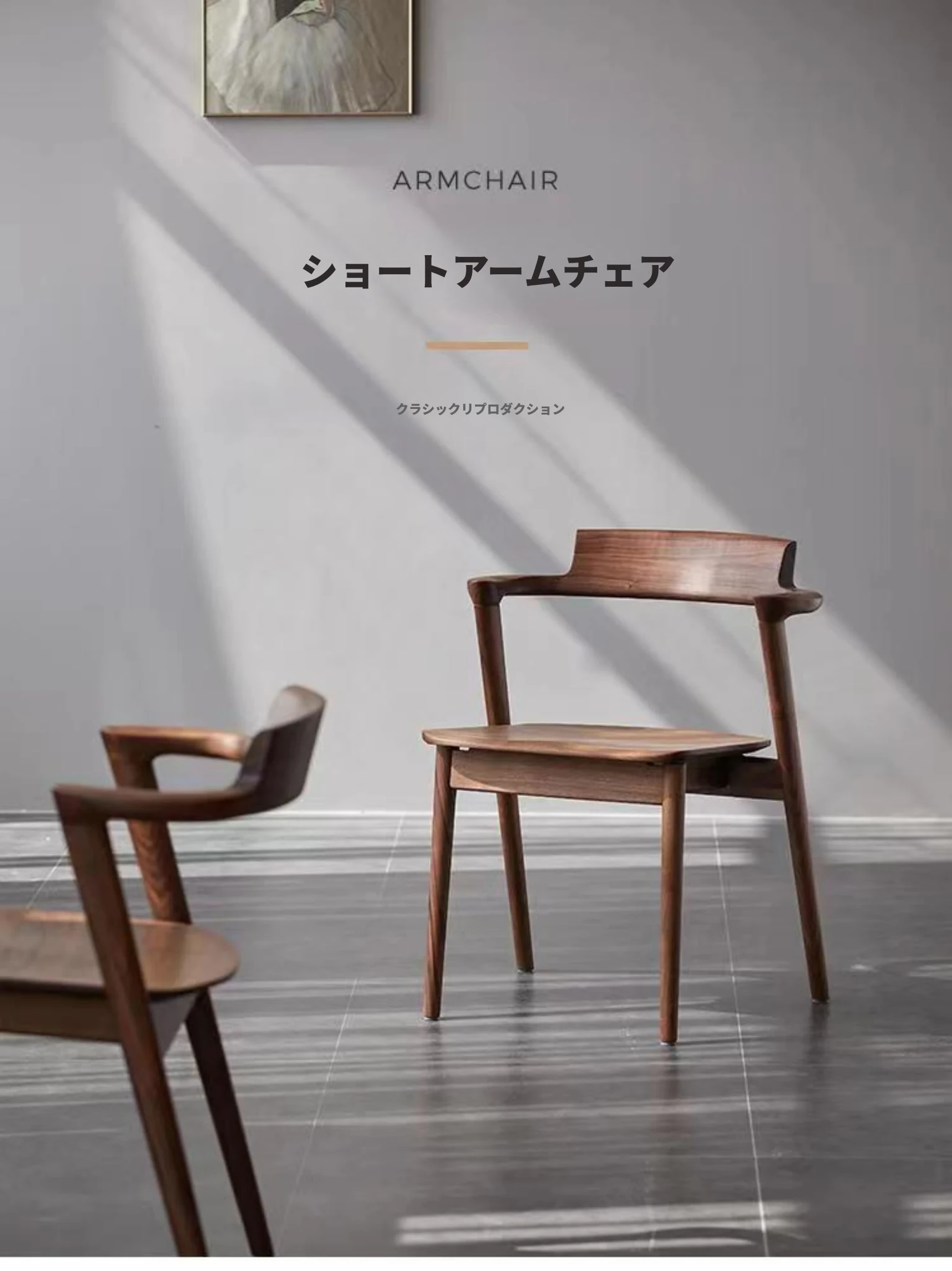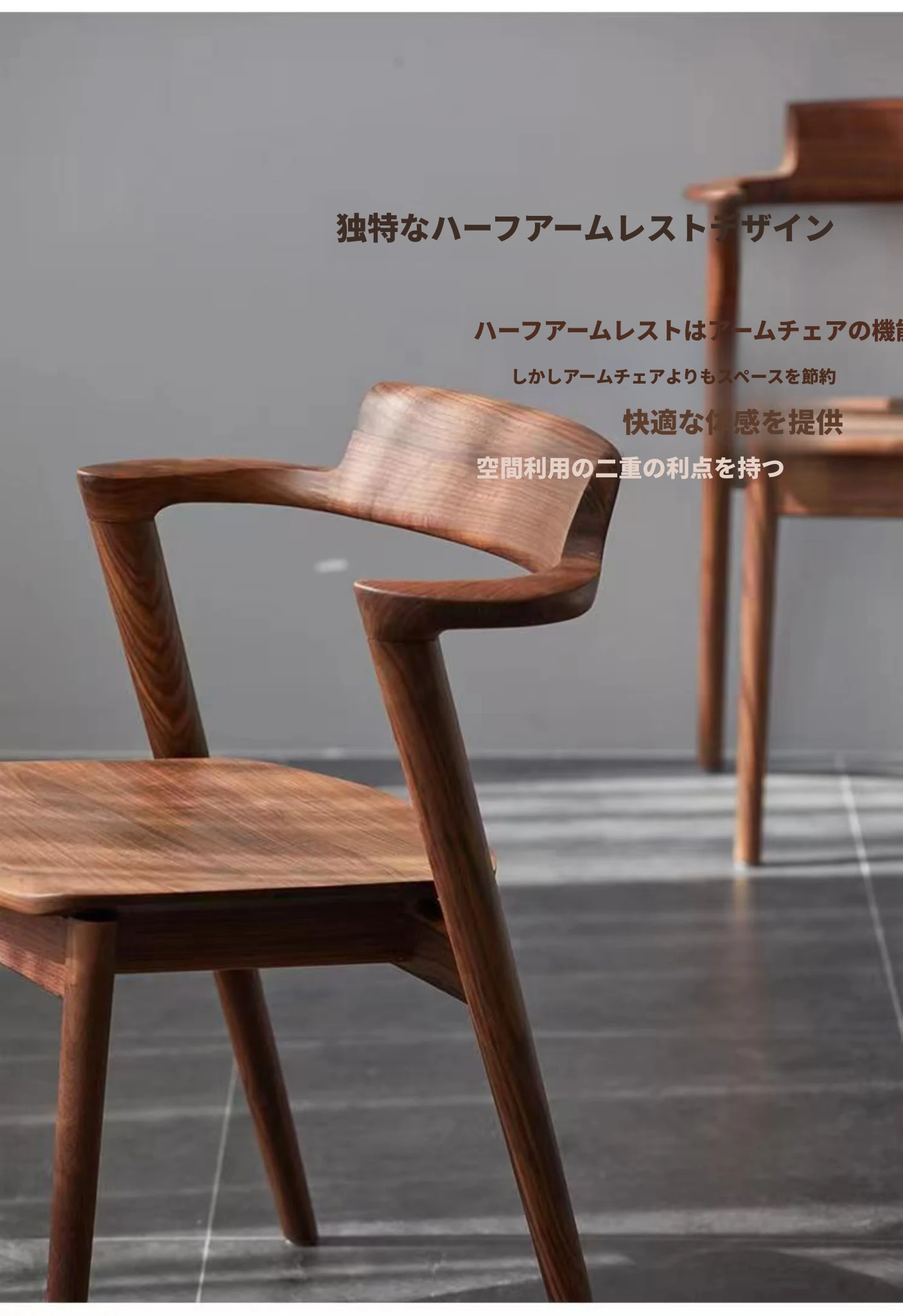 北米産ブラックウォールナット無垢材使用!おしゃれな短いアーム付きで、和モダンなデザインのダイニングチェア。書斎やリビングにも最適な北欧風!快適な座り心地で、あなたの空間を格上げします。