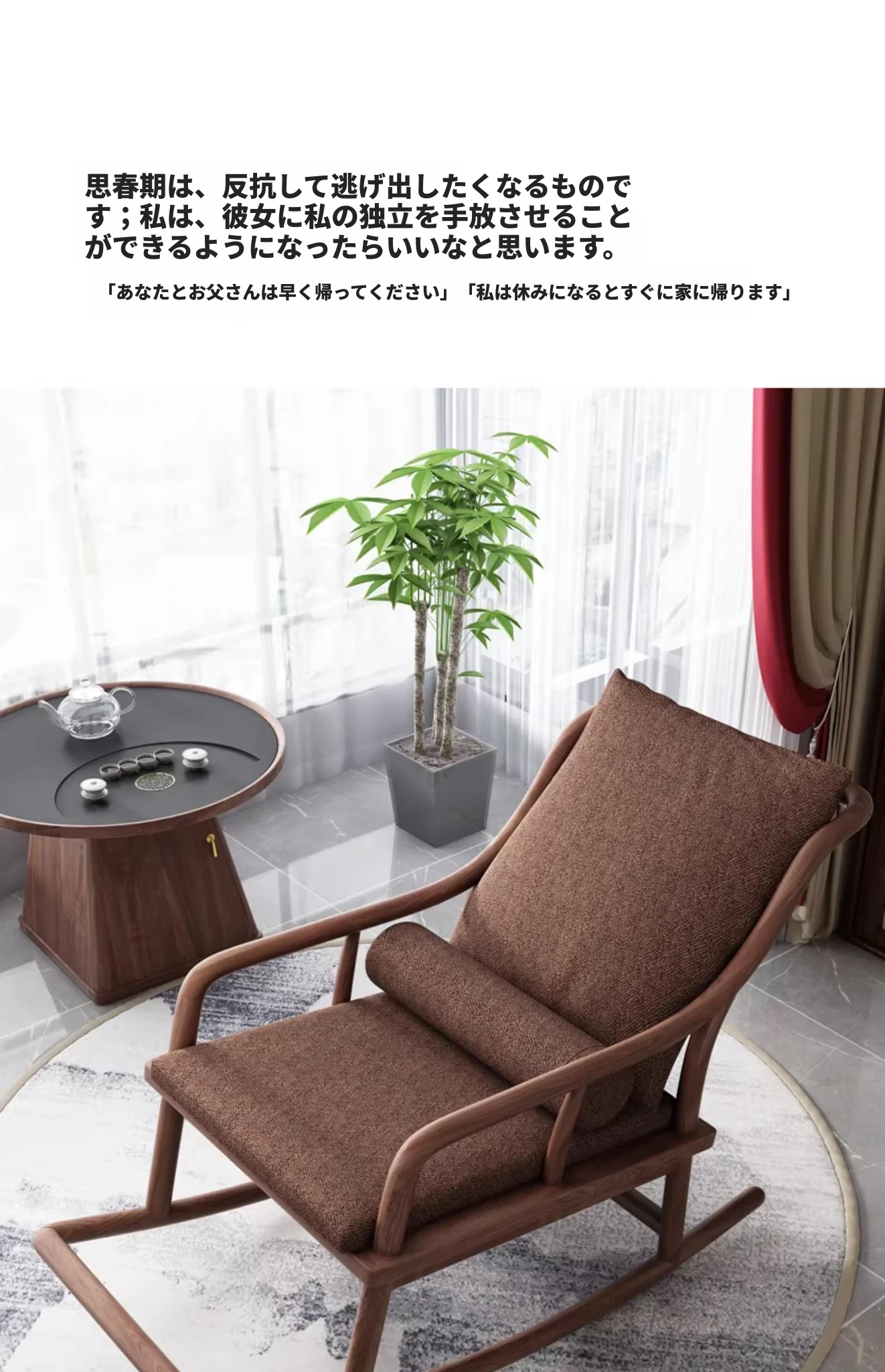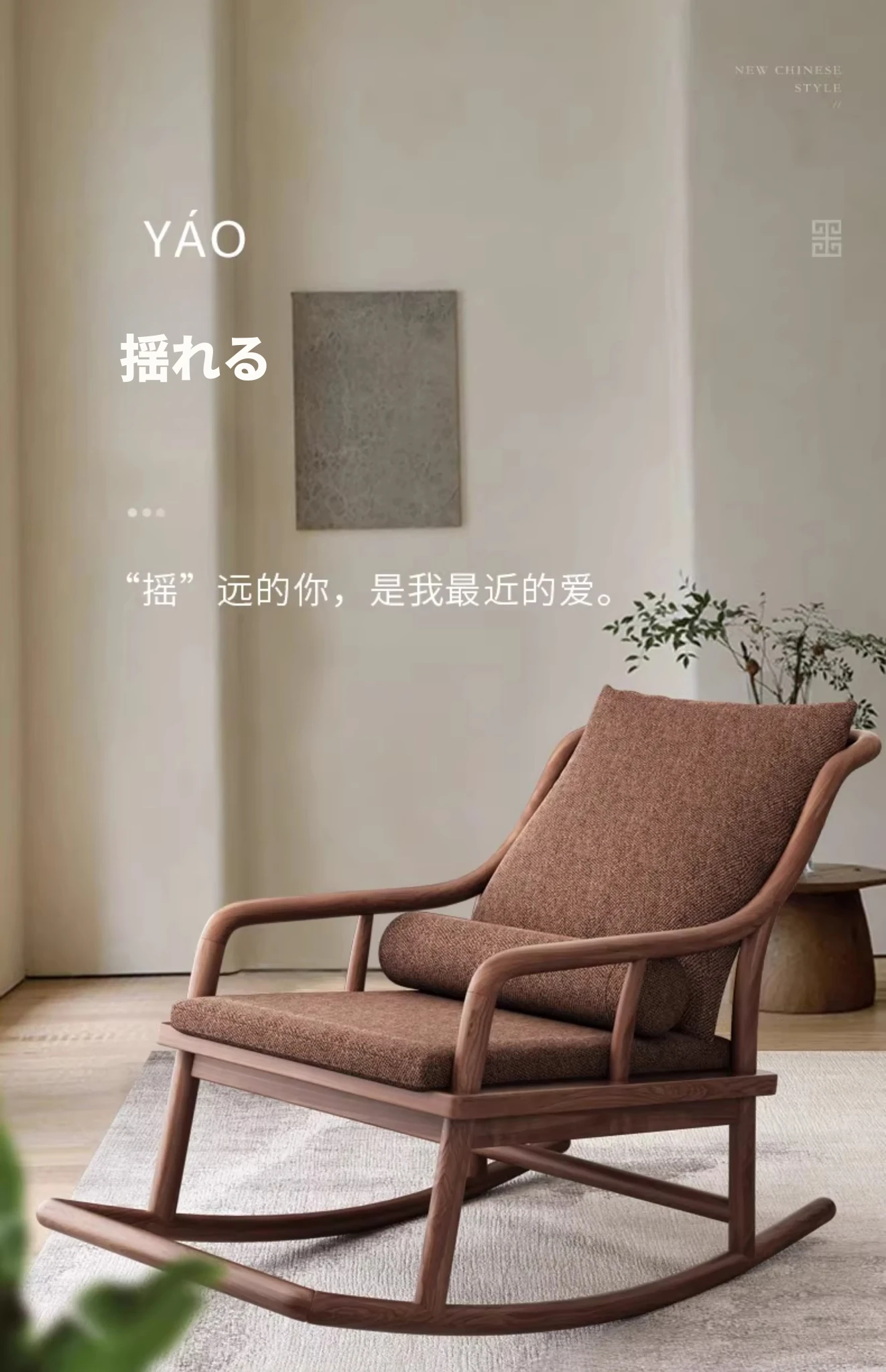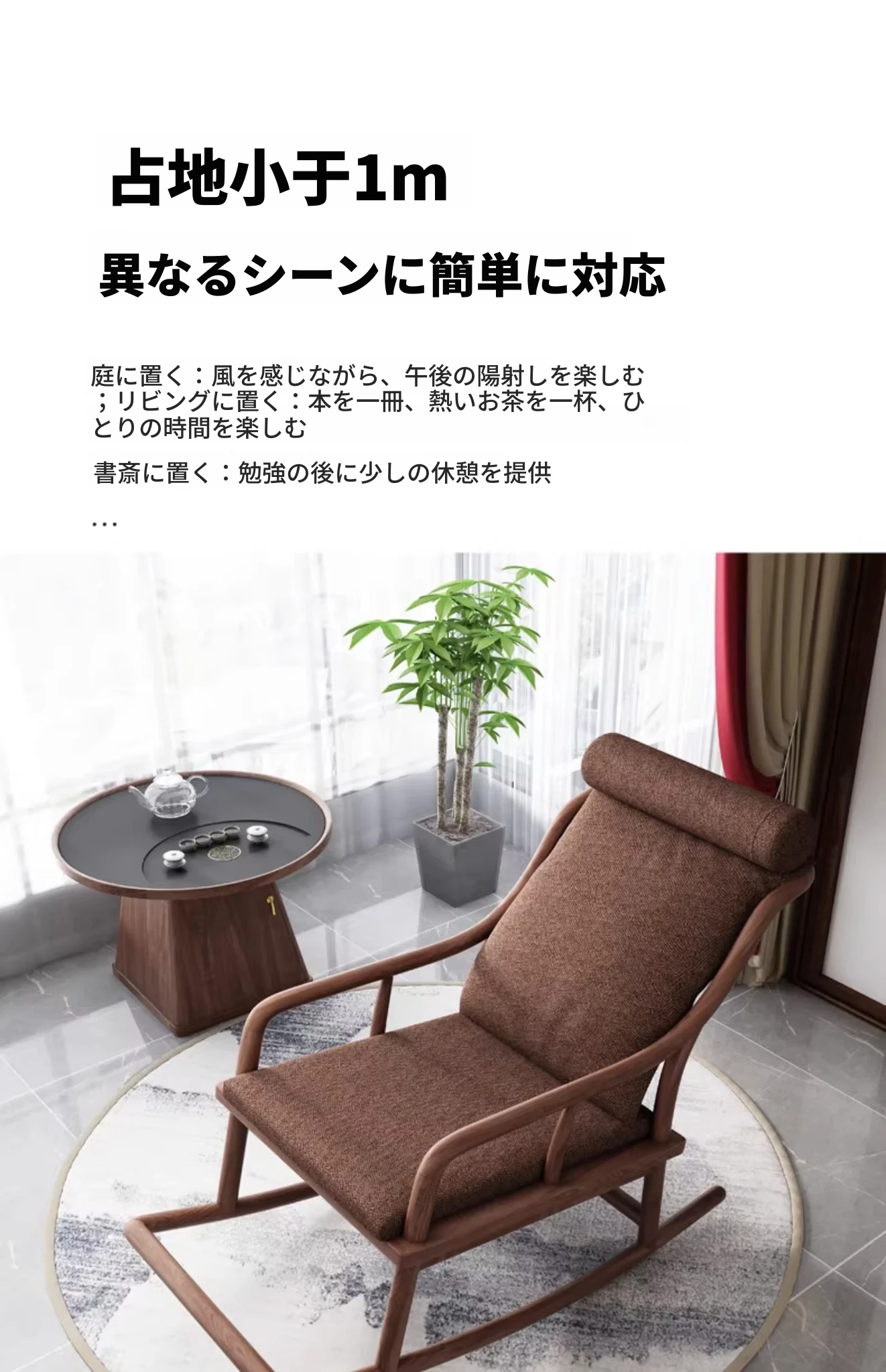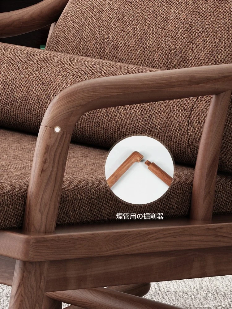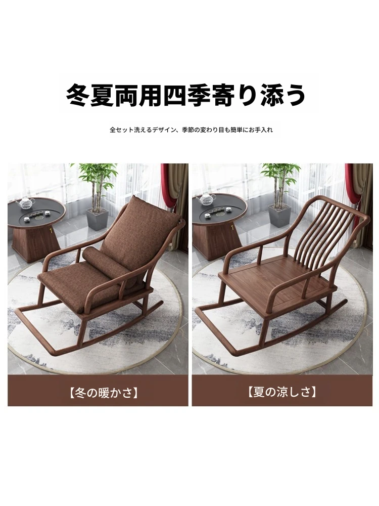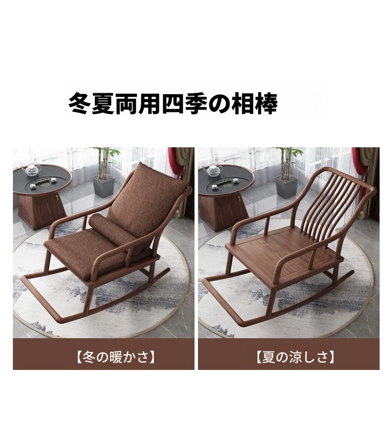 寸禾宋式美学の南米ウォールナット製新中式実木ロッキングチェア。リラックスできるバルコニー用の優雅なラウンジチェアで、心地よいひとときをお楽しみください。