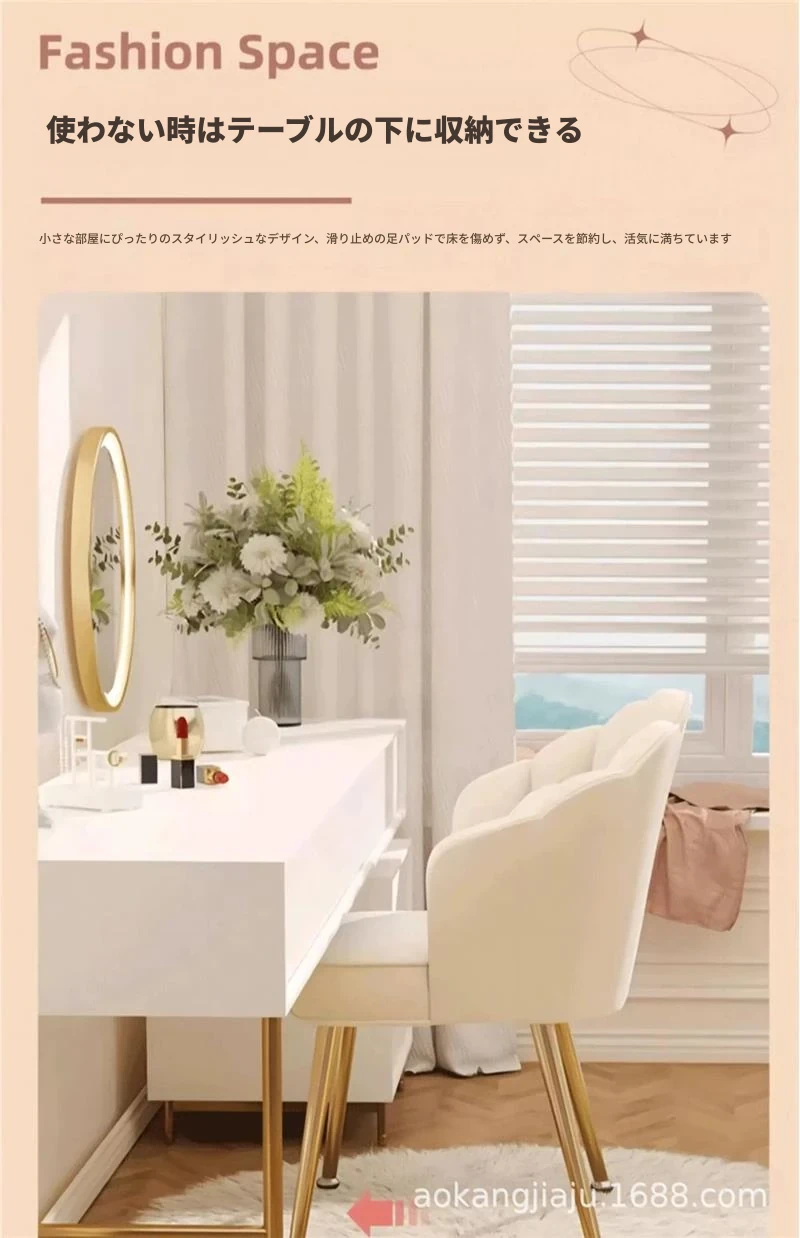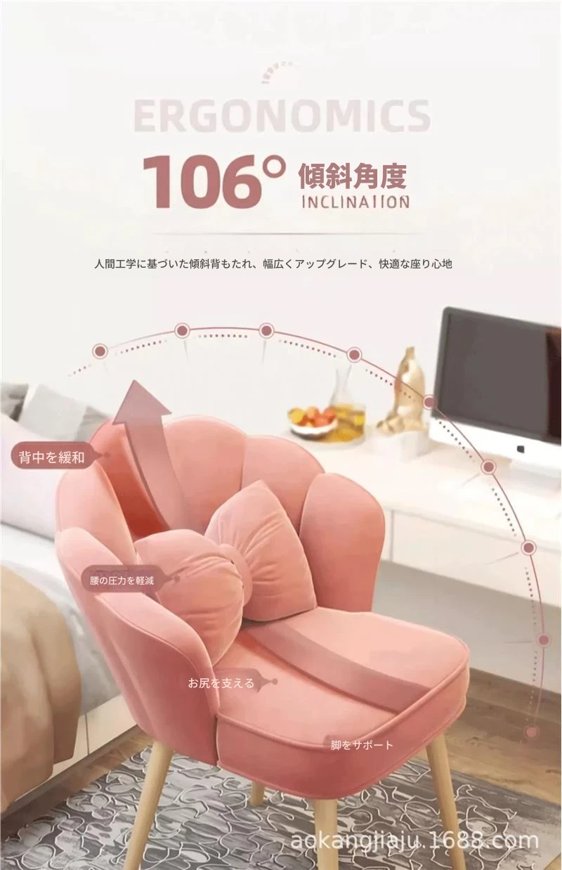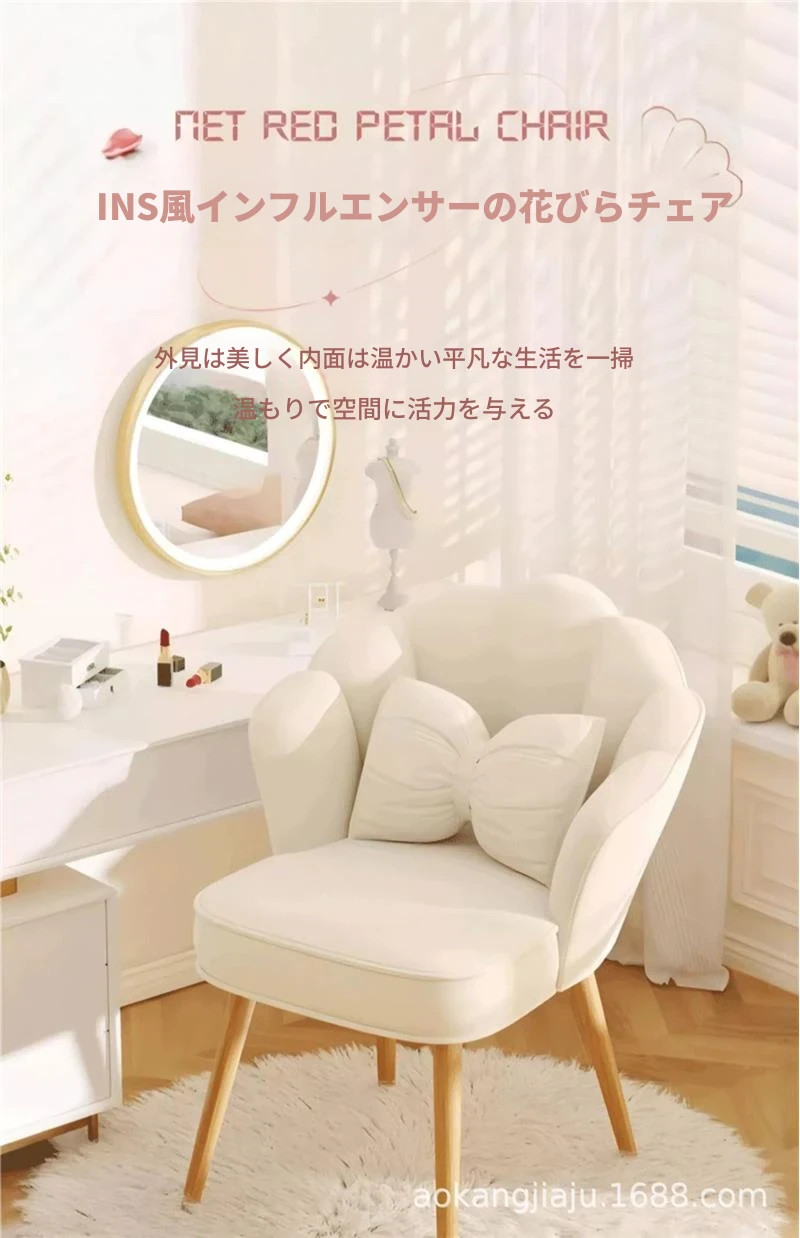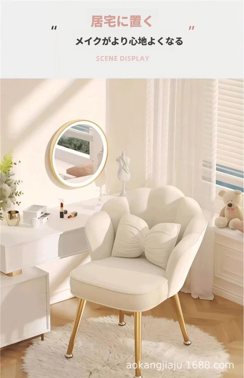 シンプルで洗練されたデザインの化粧椅子!背もたれ付きで快適さを追求。おしゃれな女の子のための花びらモチーフ、寝室やメイクアップテーブルに最適。高級感あふれる一品で、あなたの部屋を一層魅力的に演出します。