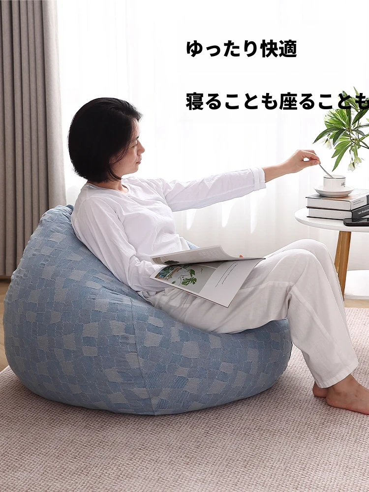 デニム生地のリラックスソファー!寝転んだり、眠ったりできる最高のアイテム。寝室や畳の上でくつろぎながら、EPP粒子で軽量&洗えるデザイン。あなたのリラックスタイムを一段と特別に!